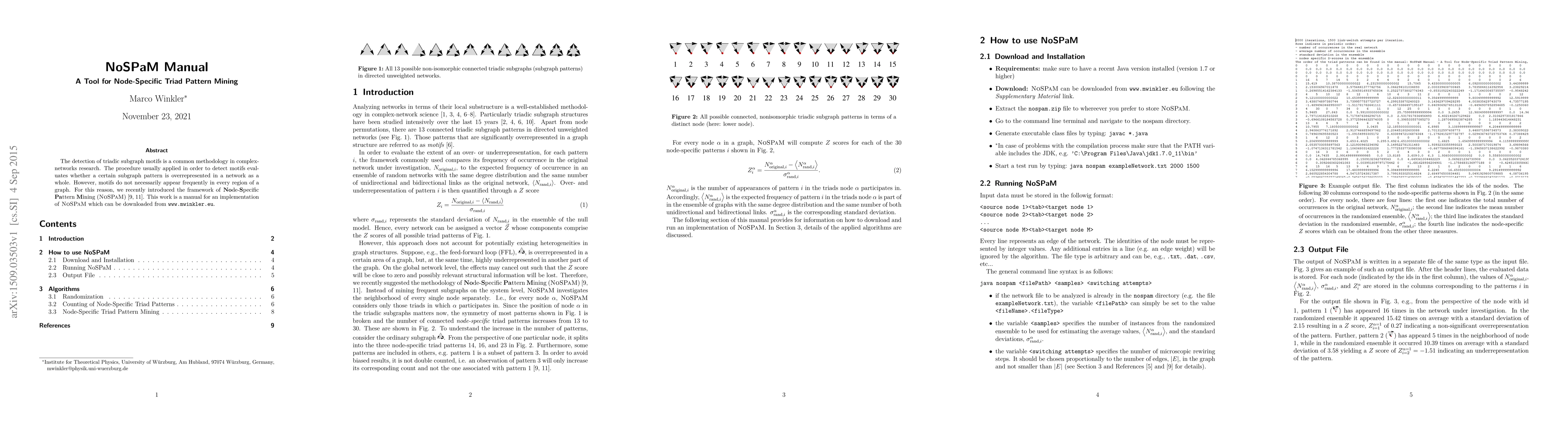 This paper introduces a manual for NoSPaM, a tool designed for node-specific triad pattern mining in complex networks. Unlike traditional motif detection, NoSPaM identifies subgraph patterns that are overrepresented in specific regions of a graph rather than the entire network.