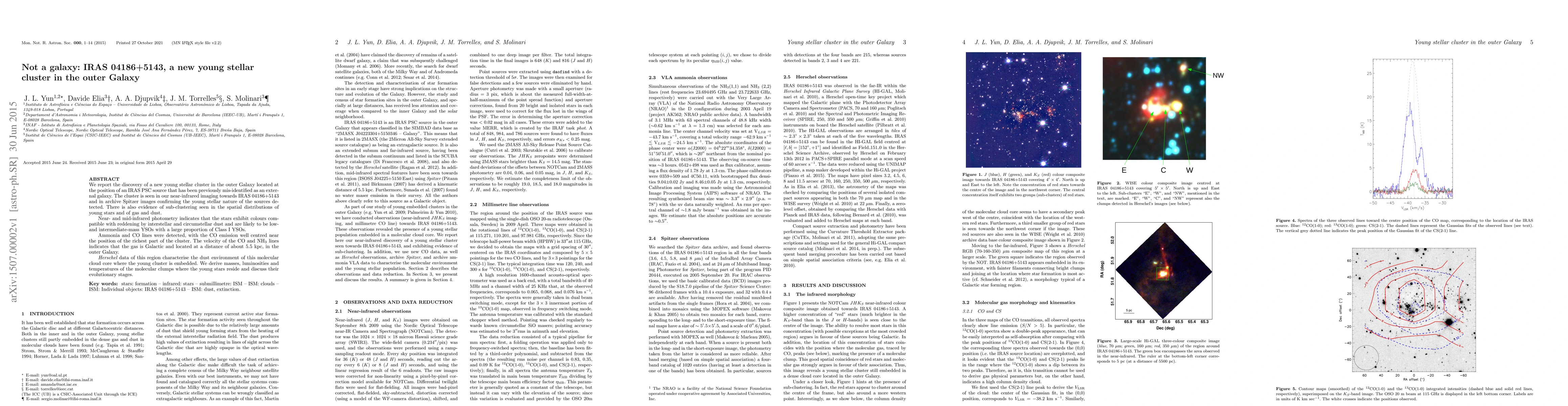 We report the discovery of a new young stellar cluster in the outer Galaxy located at the position of an IRAS PSC source that has been previously mis-identified as an external galaxy. The cluster is seen in our near-infrared imaging towards IRAS 04186+5143 and in archive Spitzer images confirming the young stellar nature of the sources detected. There is also evidence of sub-clustering seen in the spatial distributions of young stars and of gas and dust. Near- and mid-infrared photometry indicates that the stars exhibit colours compatible with reddening by interstellar and circumstellar dust and are likely to be low- and intermediate-mass YSOs with a large proportion of Class I YSOs. Ammonia and CO lines were detected, with the CO emission well centred near the position of the richest part of the cluster. The velocity of the CO and NH$_3$ lines indicates that the gas is Galactic and located at a distance of about 5.5 kpc, in the outer Galaxy. Herschel data of this region characterise the dust environment of this molecular cloud core where the young cluster is embedded. We derive masses, luminosities and temperatures of the molecular clumps where the young stars reside and discuss their evolutionary stages.