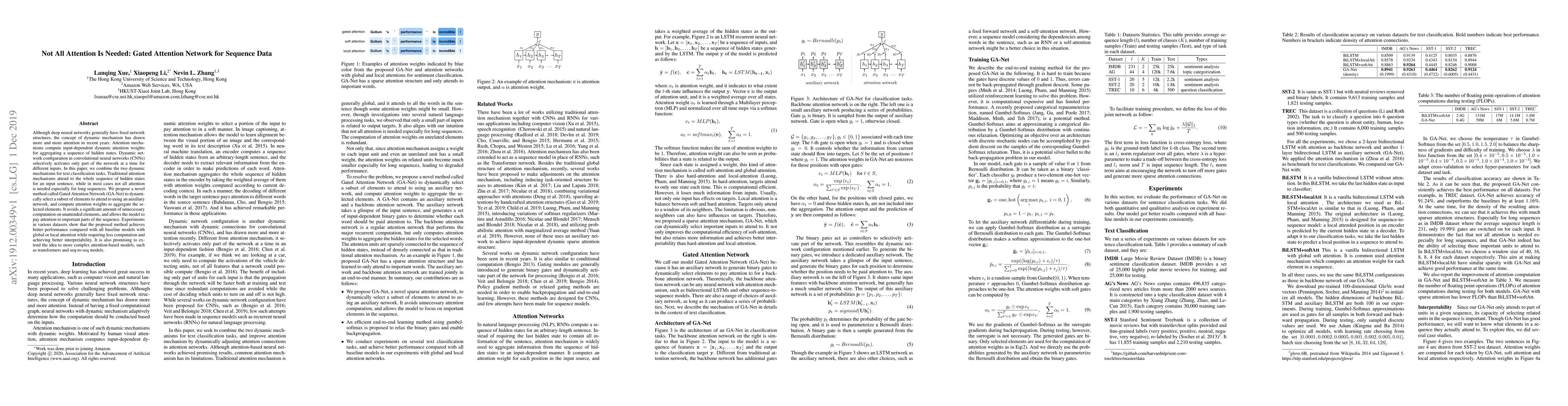 The paper introduces the Gated Attention Network (GA-Net) to dynamically select important elements in sequence data for text classification, avoiding unnecessary computations on irrelevant parts. Experiments demonstrate improved performance and efficiency over traditional attention mechanisms.