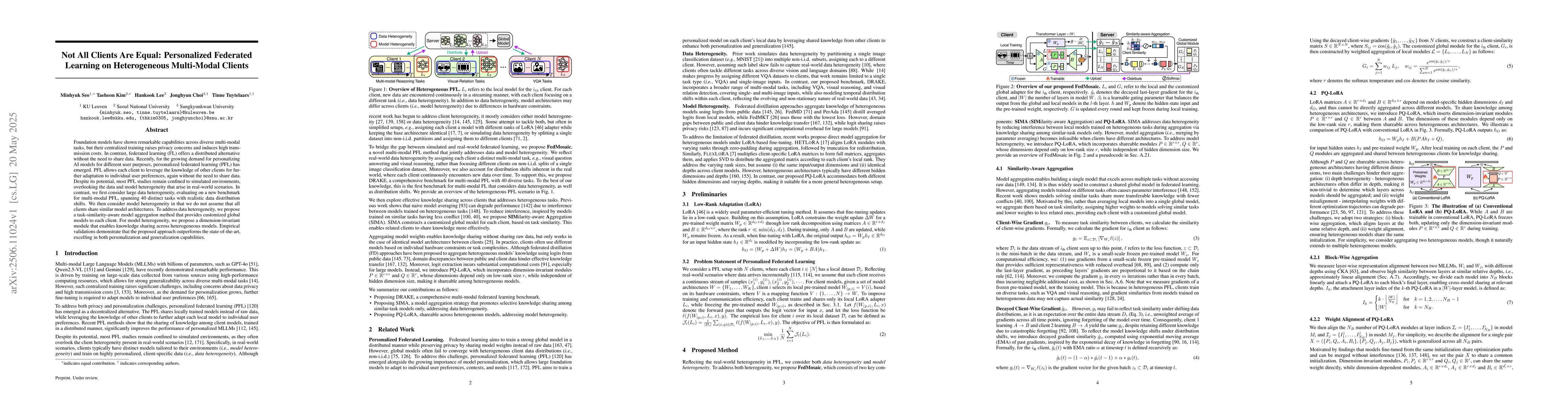 Foundation models have shown remarkable capabilities across diverse multi-modal tasks, but their centralized training raises privacy concerns and induces high transmission costs. In contrast, federated learning (FL) offers a distributed alternative without the need to share data. Recently, for the growing demand for personalizing AI models for different user purposes, personalized federated learning (PFL) has emerged. PFL allows each client to leverage the knowledge of other clients for further adaptation to individual user preferences, again without the need to share data. Despite its potential, most PFL studies remain confined to simulated environments, overlooking the data and model heterogeneity that arise in real-world scenarios. In contrast, we first consider large data heterogeneity, evaluating on a new benchmark for multi-modal PFL, spanning 40 distinct tasks with realistic data distribution shifts. We then consider model heterogeneity in that we do not assume that all clients share similar model architectures. To address data heterogeneity, we propose a task-similarity-aware model aggregation method that provides customized global models to each client. For model heterogeneity, we propose a dimension-invariant module that enables knowledge sharing across heterogeneous models. Empirical validations demonstrate that the proposed approach outperforms the state-of-the-art, excelling in both personalization and generalization capabilities.