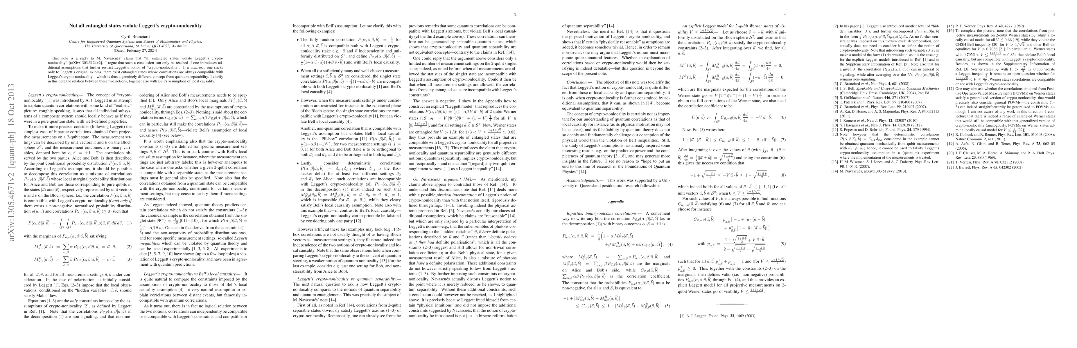 This note is a reply to M. Navascu\'es' claim that "all entangled states violate Leggett's crypto-nonlocality" [arXiv:1303.5124v2]. I argue that such a conclusion can only be reached if one introduces additional assumptions that further restrict Leggett's notion of "crypto-nonlocality". If a contrario one sticks only to Leggett's original axioms, there exist entangled states whose correlations are always compatible with Leggett's crypto-nonlocality---which is thus a genuinely different concept from quantum separability. I clarify in this note the relation between these two notions, together also with Bell's assumption of local causality.