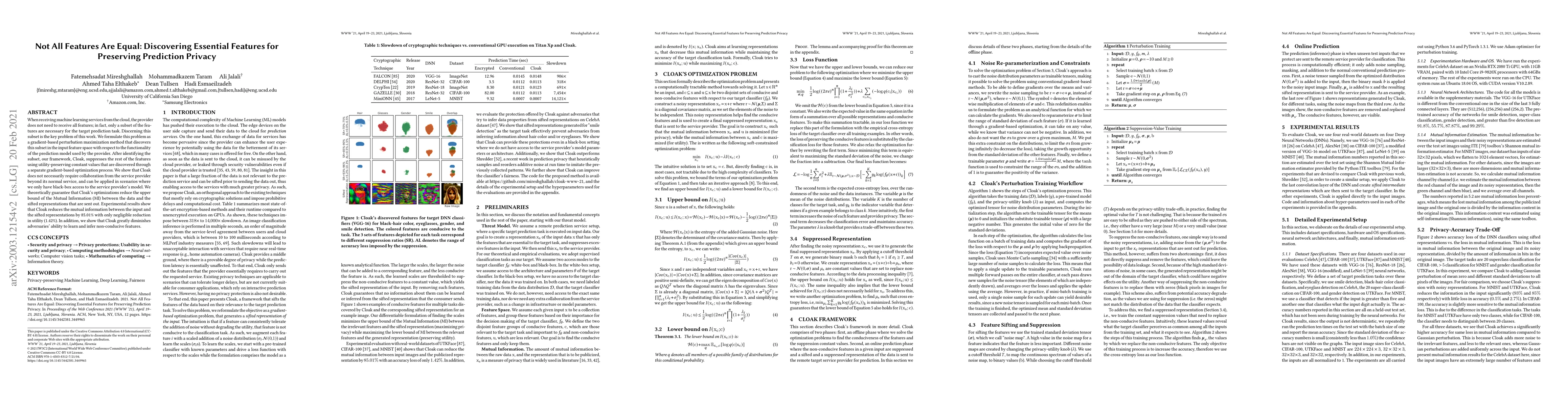 Researchers developed a framework called Cloak to selectively reveal only essential features for machine learning predictions while preserving prediction privacy, reducing mutual information between input and representations by 85%.
