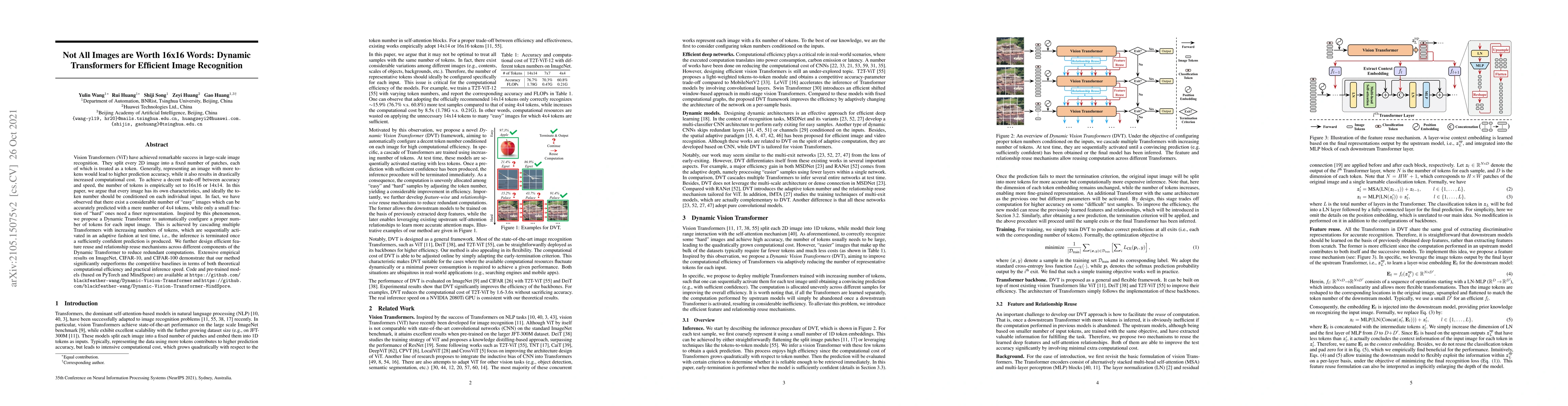 Vision Transformers (ViT) have achieved remarkable success in large-scale image recognition. They split every 2D image into a fixed number of patches, each of which is treated as a token. Generally, representing an image with more tokens would lead to higher prediction accuracy, while it also results in drastically increased computational cost. To achieve a decent trade-off between accuracy and speed, the number of tokens is empirically set to 16x16 or 14x14. In this paper, we argue that every image has its own characteristics, and ideally the token number should be conditioned on each individual input. In fact, we have observed that there exist a considerable number of "easy" images which can be accurately predicted with a mere number of 4x4 tokens, while only a small fraction of "hard" ones need a finer representation. Inspired by this phenomenon, we propose a Dynamic Transformer to automatically configure a proper number of tokens for each input image. This is achieved by cascading multiple Transformers with increasing numbers of tokens, which are sequentially activated in an adaptive fashion at test time, i.e., the inference is terminated once a sufficiently confident prediction is produced. We further design efficient feature reuse and relationship reuse mechanisms across different components of the Dynamic Transformer to reduce redundant computations. Extensive empirical results on ImageNet, CIFAR-10, and CIFAR-100 demonstrate that our method significantly outperforms the competitive baselines in terms of both theoretical computational efficiency and practical inference speed. Code and pre-trained models (based on PyTorch and MindSpore) are available at https://github.com/blackfeather-wang/Dynamic-Vision-Transformer and https://github.com/blackfeather-wang/Dynamic-Vision-Transformer-MindSpore.