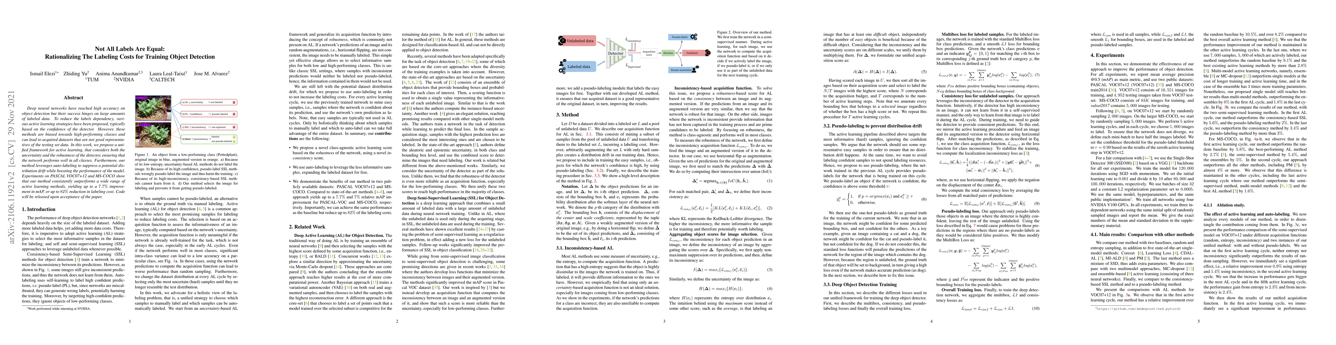 Deep neural networks have reached high accuracy on object detection but their success hinges on large amounts of labeled data. To reduce the labels dependency, various active learning strategies have been proposed, typically based on the confidence of the detector. However, these methods are biased towards high-performing classes and can lead to acquired datasets that are not good representatives of the testing set data. In this work, we propose a unified framework for active learning, that considers both the uncertainty and the robustness of the detector, ensuring that the network performs well in all classes. Furthermore, our method leverages auto-labeling to suppress a potential distribution drift while boosting the performance of the model. Experiments on PASCAL VOC07+12 and MS-COCO show that our method consistently outperforms a wide range of active learning methods, yielding up to a 7.7% improvement in mAP, or up to 82% reduction in labeling cost. Code will be released upon acceptance of the paper.
