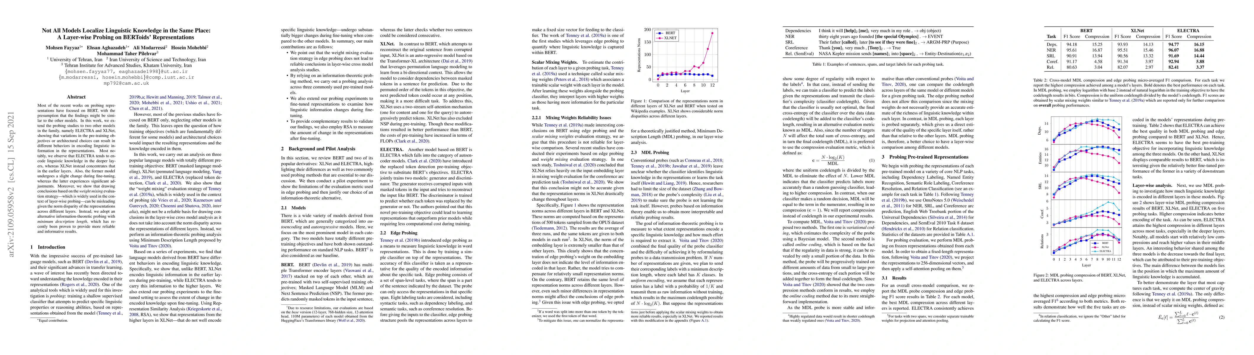 Most of the recent works on probing representations have focused on BERT, with the presumption that the findings might be similar to the other models. In this work, we extend the probing studies to two other models in the family, namely ELECTRA and XLNet, showing that variations in the pre-training objectives or architectural choices can result in different behaviors in encoding linguistic information in the representations. Most notably, we observe that ELECTRA tends to encode linguistic knowledge in the deeper layers, whereas XLNet instead concentrates that in the earlier layers. Also, the former model undergoes a slight change during fine-tuning, whereas the latter experiences significant adjustments. Moreover, we show that drawing conclusions based on the weight mixing evaluation strategy -- which is widely used in the context of layer-wise probing -- can be misleading given the norm disparity of the representations across different layers. Instead, we adopt an alternative information-theoretic probing with minimum description length, which has recently been proven to provide more reliable and informative results.