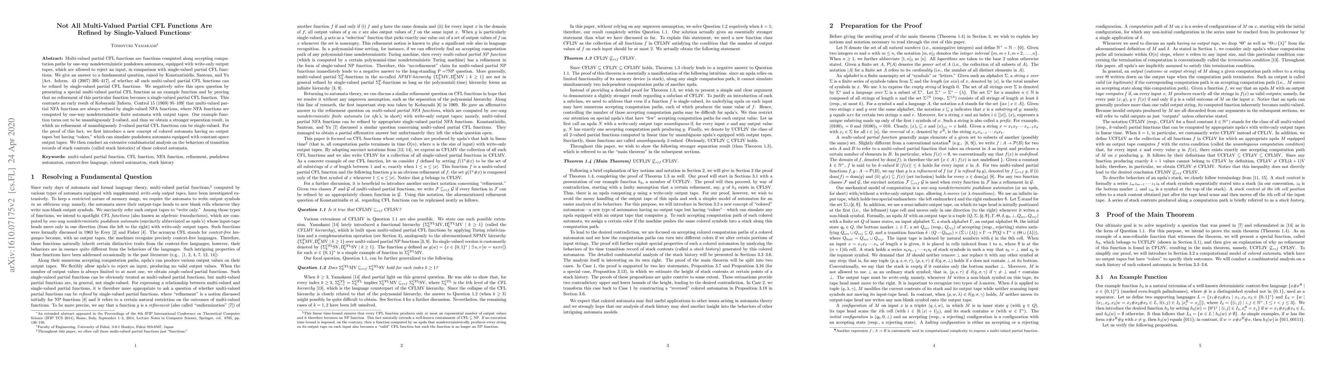 This paper demonstrates that not all multi-valued partial context-free language (CFL) functions can be refined by single-valued partial CFL functions, contrasting with the result for nondeterministic finite automata (NFA) functions. It introduces a new concept of colored automata to prove that a specific multi-valued partial CFL function cannot be refined into a single-valued form, thereby establishing a stronger separation between multi-valued and single-valued partial CFL functions.