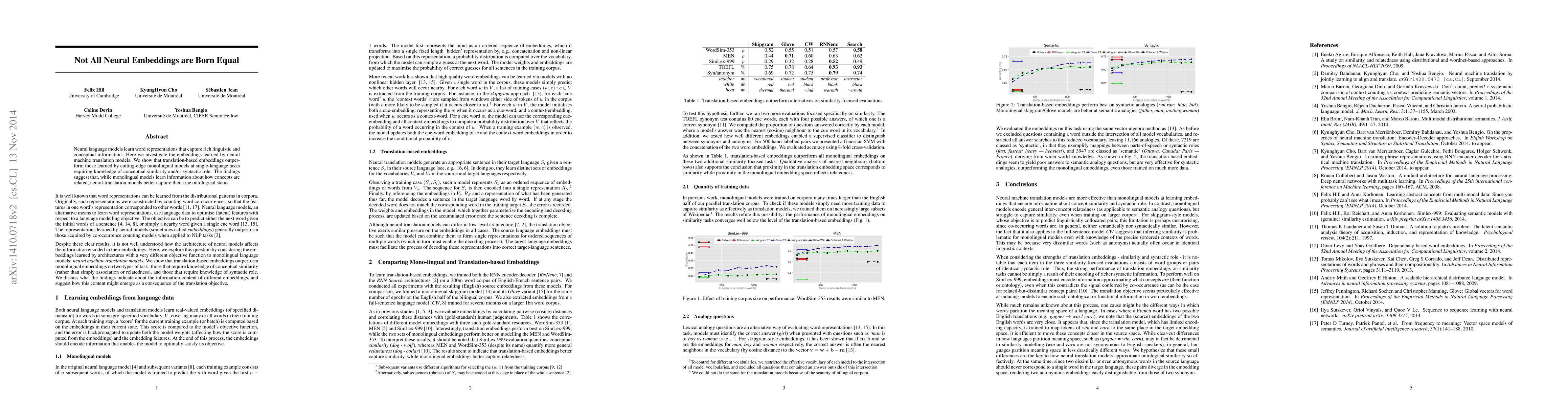 This paper examines neural embeddings from neural machine translation models, demonstrating their superior performance over monolingual models in tasks requiring conceptual similarity and syntactic role understanding, indicating that translation-based embeddings better capture the true ontological status of concepts.