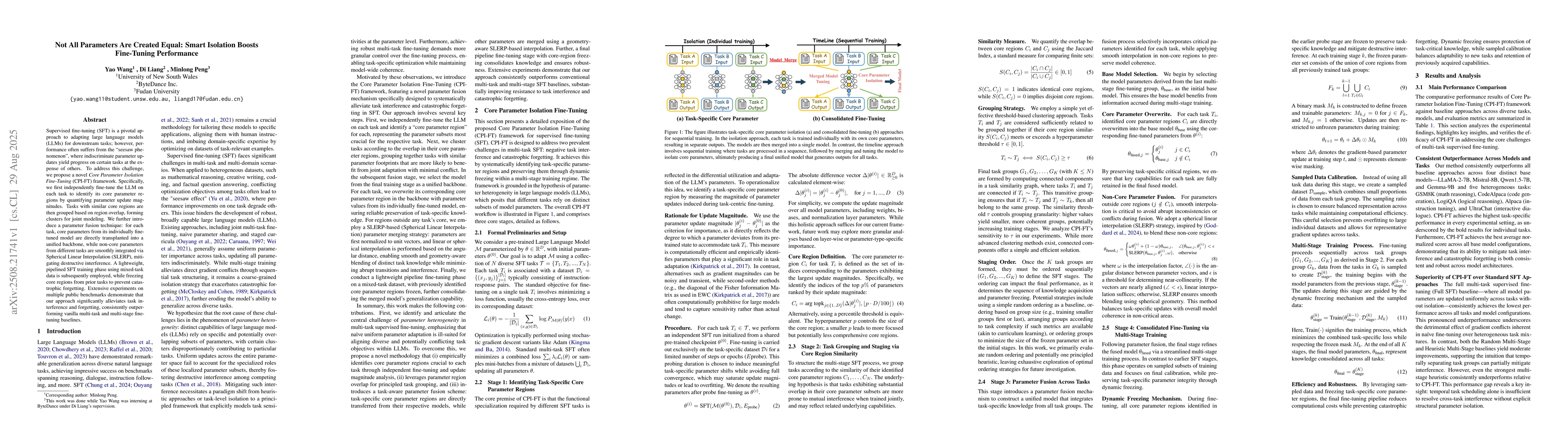 Supervised fine-tuning (SFT) is a pivotal approach to adapting large language models (LLMs) for downstream tasks; however, performance often suffers from the ``seesaw phenomenon'', where indiscriminate parameter updates yield progress on certain tasks at the expense of others. To address this challenge, we propose a novel \emph{Core Parameter Isolation Fine-Tuning} (CPI-FT) framework. Specifically, we first independently fine-tune the LLM on each task to identify its core parameter regions by quantifying parameter update magnitudes. Tasks with similar core regions are then grouped based on region overlap, forming clusters for joint modeling. We further introduce a parameter fusion technique: for each task, core parameters from its individually fine-tuned model are directly transplanted into a unified backbone, while non-core parameters from different tasks are smoothly integrated via Spherical Linear Interpolation (SLERP), mitigating destructive interference. A lightweight, pipelined SFT training phase using mixed-task data is subsequently employed, while freezing core regions from prior tasks to prevent catastrophic forgetting. Extensive experiments on multiple public benchmarks demonstrate that our approach significantly alleviates task interference and forgetting, consistently outperforming vanilla multi-task and multi-stage fine-tuning baselines.
