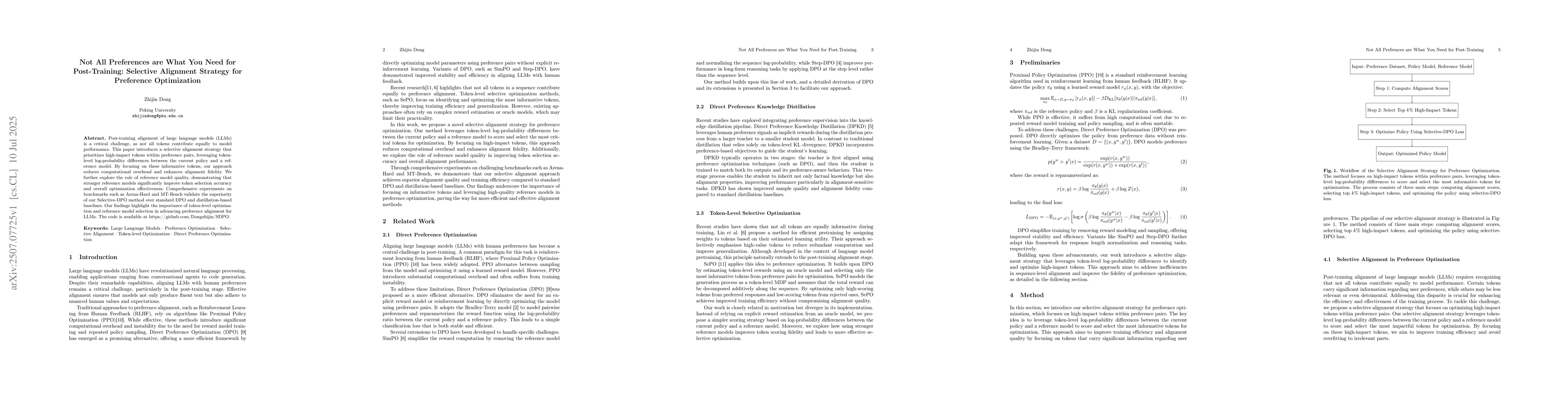 Post-training alignment of large language models (LLMs) is a critical challenge, as not all tokens contribute equally to model performance. This paper introduces a selective alignment strategy that prioritizes high-impact tokens within preference pairs, leveraging token-level log-probability differences between the current policy and a reference model. By focusing on these informative tokens, our approach reduces computational overhead and enhances alignment fidelity. We further explore the role of reference model quality, demonstrating that stronger reference models significantly improve token selection accuracy and overall optimization effectiveness. Comprehensive experiments on benchmarks such as Arena-Hard and MT-Bench validate the superiority of our Selective-DPO method over standard DPO and distillation-based baselines. Our findings highlight the importance of token-level optimization and reference model selection in advancing preference alignment for LLMs. The code is available at https://github.com/Dongzhijin/SDPO.