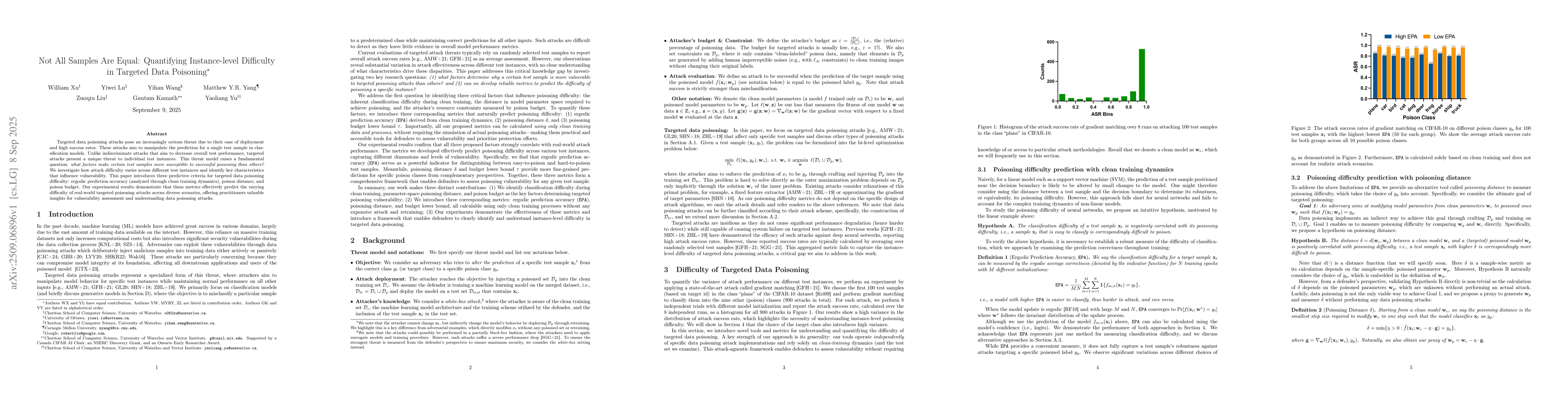Targeted data poisoning attacks pose an increasingly serious threat due to their ease of deployment and high success rates. These attacks aim to manipulate the prediction for a single test sample in classification models. Unlike indiscriminate attacks that aim to decrease overall test performance, targeted attacks present a unique threat to individual test instances. This threat model raises a fundamental question: what factors make certain test samples more susceptible to successful poisoning than others? We investigate how attack difficulty varies across different test instances and identify key characteristics that influence vulnerability. This paper introduces three predictive criteria for targeted data poisoning difficulty: ergodic prediction accuracy (analyzed through clean training dynamics), poison distance, and poison budget. Our experimental results demonstrate that these metrics effectively predict the varying difficulty of real-world targeted poisoning attacks across diverse scenarios, offering practitioners valuable insights for vulnerability assessment and understanding data poisoning attacks.