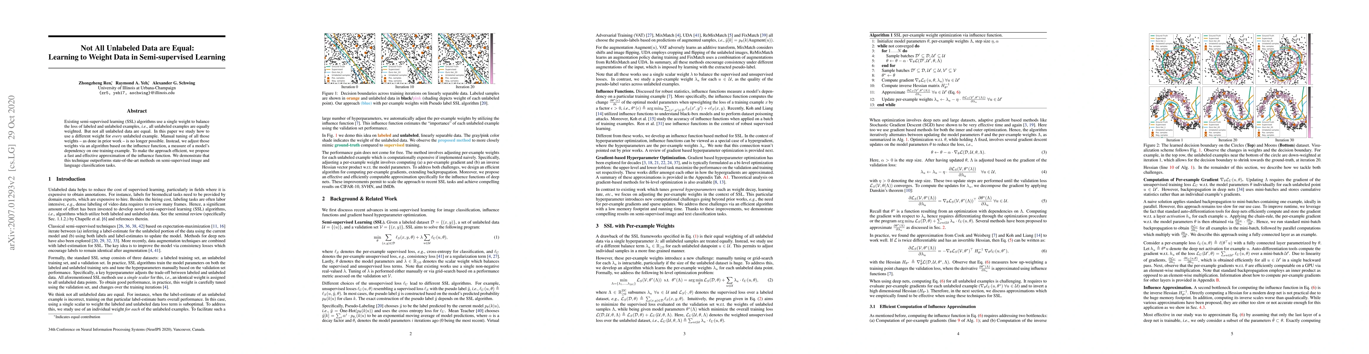 This paper proposes a novel semi-supervised learning method that assigns different weights to individual unlabeled examples, rather than using a single weight for all. It introduces an algorithm based on the influence function to dynamically adjust these weights, and presents an efficient approximation to make the approach feasible. The method outperforms existing state-of-the-art techniques in image and language classification tasks.
