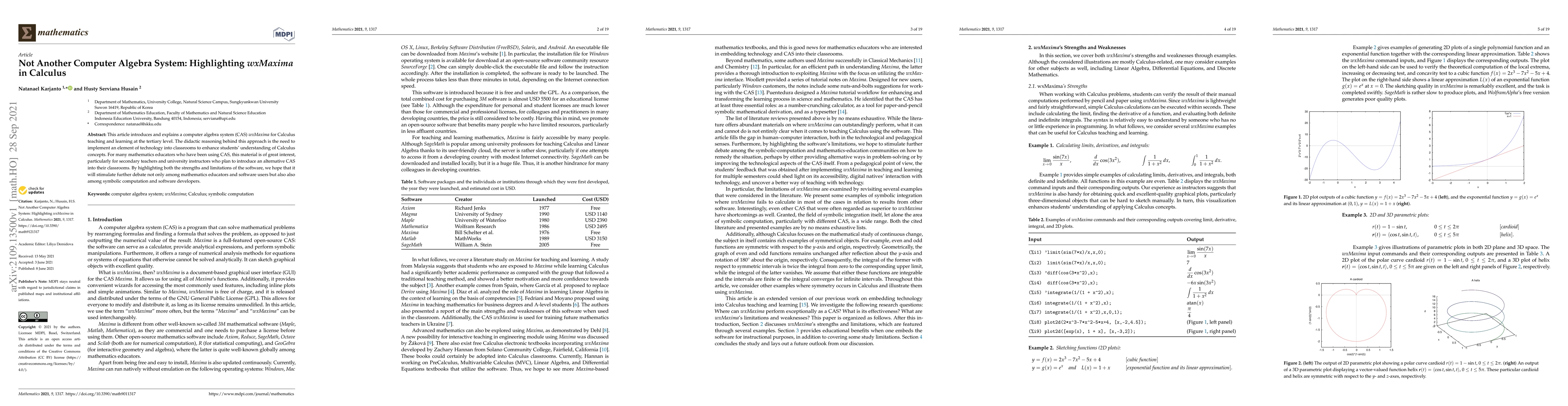 This article introduces and explains a computer algebra system (CAS) wxMaxima for Calculus teaching and learning at the tertiary level. The didactic reasoning behind this approach is the need to implement an element of technology into classrooms to enhance students' understanding of Calculus concepts. For many mathematics educators who have been using CAS, this material is of great interest, particularly for secondary teachers and university instructors who plan to introduce an alternative CAS into their classrooms. By highlighting both the strengths and limitations of the software, we hope that it will stimulate further debate not only among mathematics educators and software users but also also among symbolic computation and software developers.