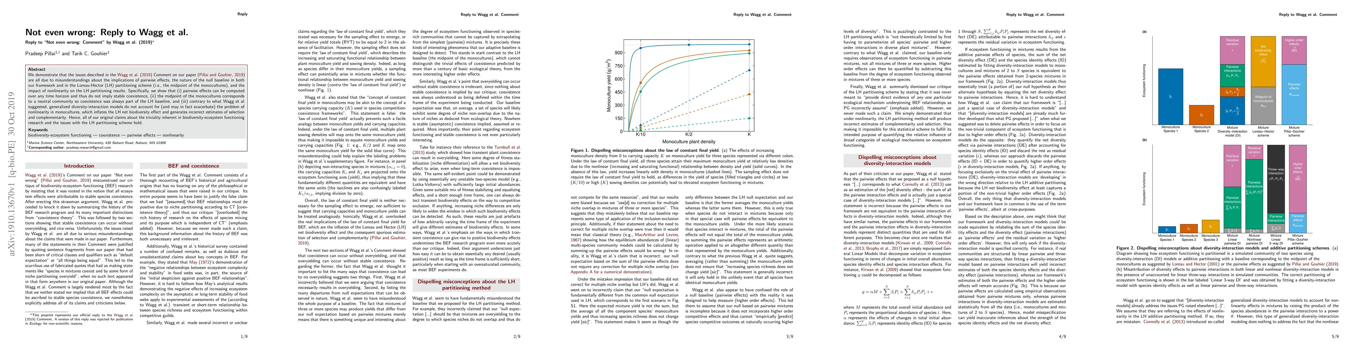 We demonstrate that the issues described in the Wagg et al. (2019) Comment on our paper (Pillai and Gouhier, 2019) are all due to misunderstandings about the implications of pairwise effects, the nature of the null baseline in both our framework and in the Loreau-Hector (LH) partitioning scheme (i.e., the midpoint of the monocultures), and the impact of nonlinearity on the LH partitioning results. Specifically, we show that (i) pairwise effects can be computed over any time horizon and thus do not imply stable coexistence, (ii) the midpoint of the monocultures corresponds to a neutral community so coexistence was always part of the LH baseline, and (iii) contrary to what Wagg et al. suggested, generalized diversity-interaction models do not account for (and may in fact exacerbate) the problem of nonlinearity in monocultures, which inflates the LH net biodiversity effect and generates incorrect estimates of selection and complementarity. Hence, all of our original claims about the triviality inherent in biodiversity-ecosystem functioning research and the issues with the LH partitioning scheme hold.