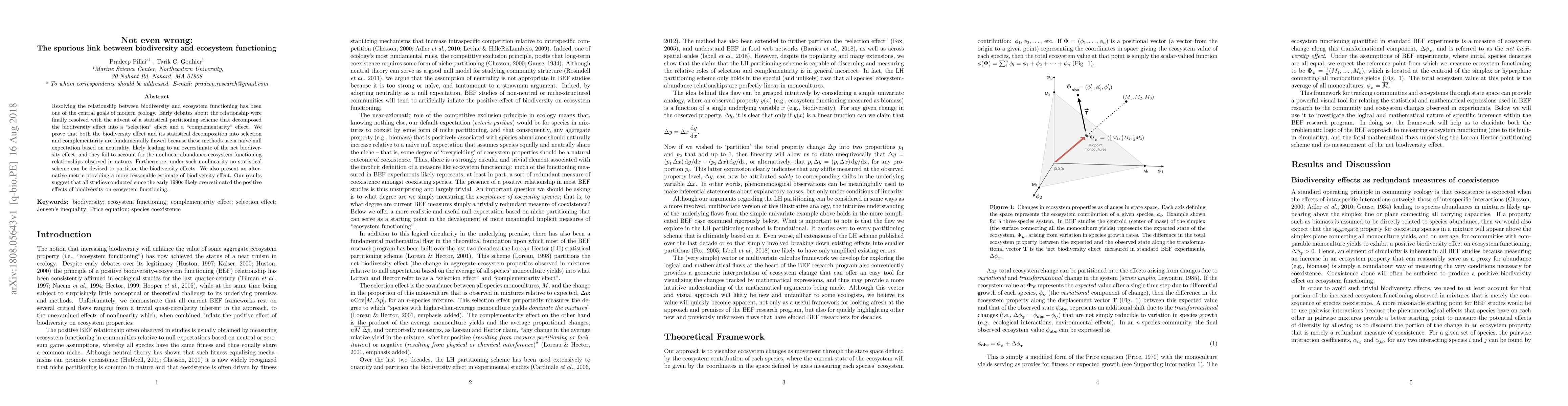This paper argues that the widely accepted statistical methods used to link biodiversity to ecosystem functioning are flawed due to a naive null expectation and failure to account for nonlinear abundance-ecosystem relationships. The authors propose an alternative metric and suggest that previous studies have overestimated the positive effects of biodiversity on ecosystem functioning.