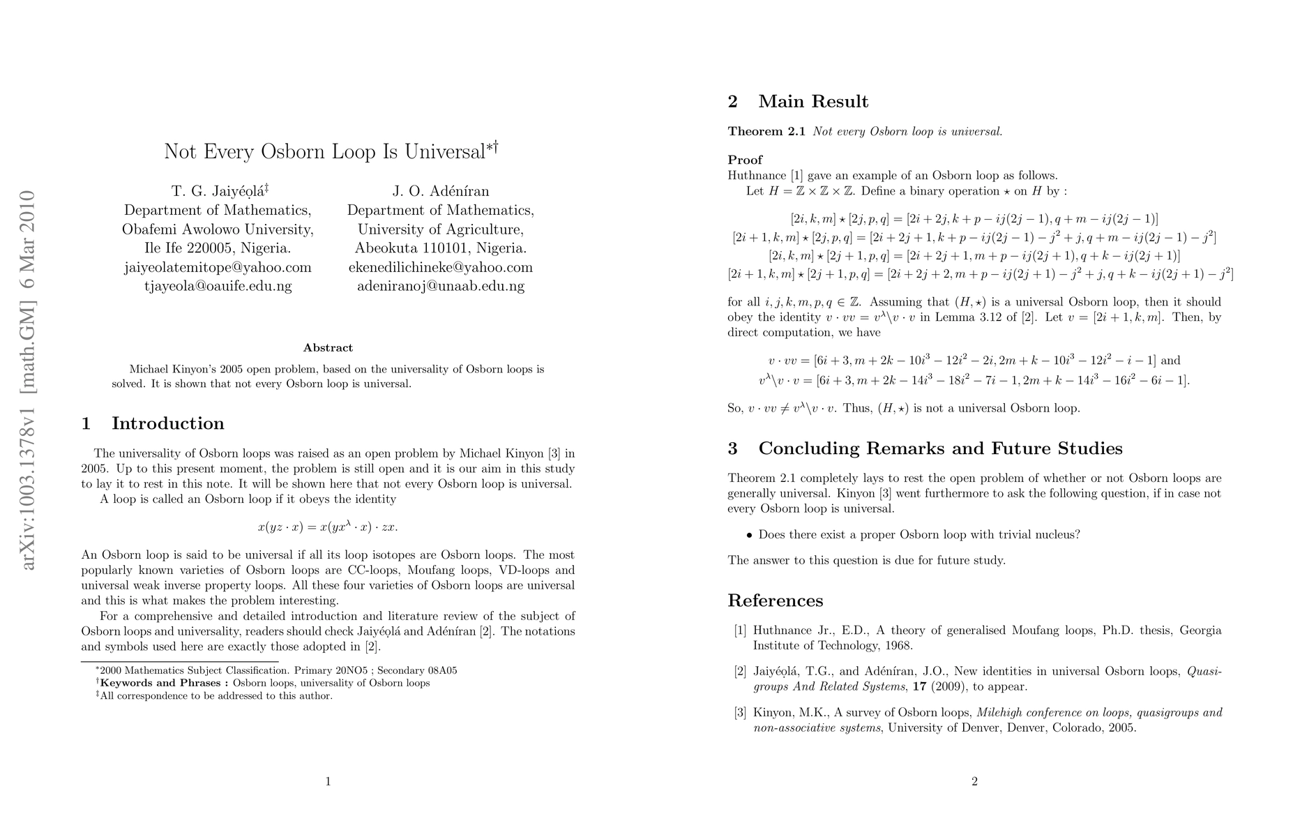 Michael Kinyon's 2005 open problem, based on the universality of Osborn loops is solved. It is shown that not every Osborn loop is universal.