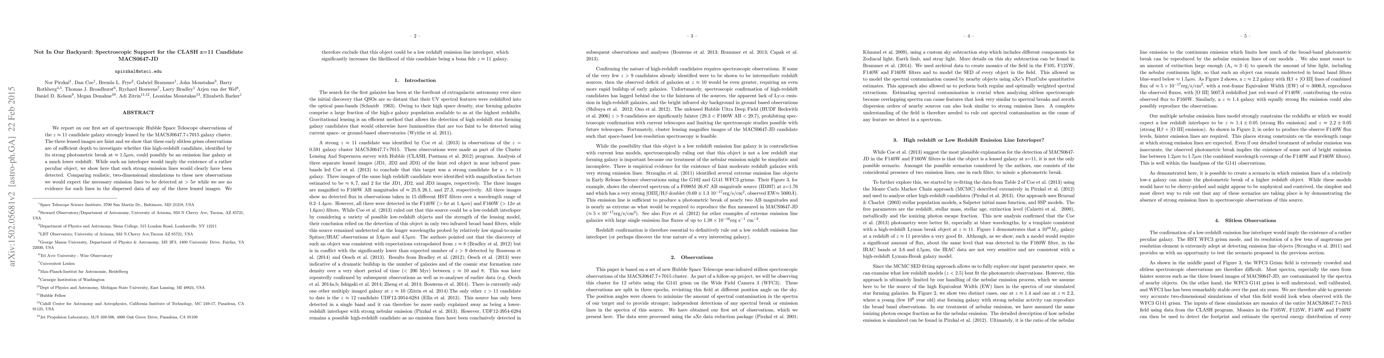 We report on our first set of spectroscopic Hubble Space Telescope observations of the z~11 candidate galaxy strongly lensed by the MACSJ0647.7+7015 galaxy cluster. The three lensed images are faint and we show that these early slitless grism observations are of sufficient depth to investigate whether this high-redshift candidate, identified by its strong photometric break at ~1.5 micron, could possibly be an emission line galaxy at a much lower redshift. While such an interloper would imply the existence of a rather peculiar object, we show here that such strong emission lines would clearly have been detected. Comparing realistic, two-dimensional simulations to these new observations we would expect the necessary emission lines to be detected at >5 sigma while we see no evidence for such lines in the dispersed data of any of the three lensed images. We therefore exclude that this object could be a low redshift emission line interloper, which significantly increases the likelihood of this candidate being a bona fide z~11 galaxy.
