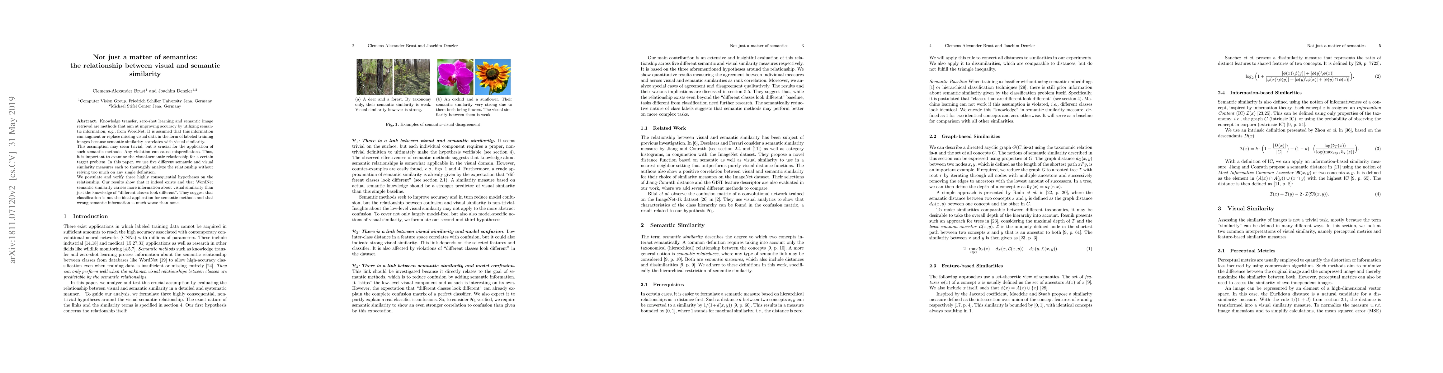 This paper explores the relationship between visual and semantic similarity, emphasizing its importance for methods like knowledge transfer and zero-shot learning. The study uses five measures to analyze this relationship, confirming its existence and suggesting that WordNet semantic similarity provides valuable information about visual similarity, indicating that semantic methods may not be ideal for classification.
