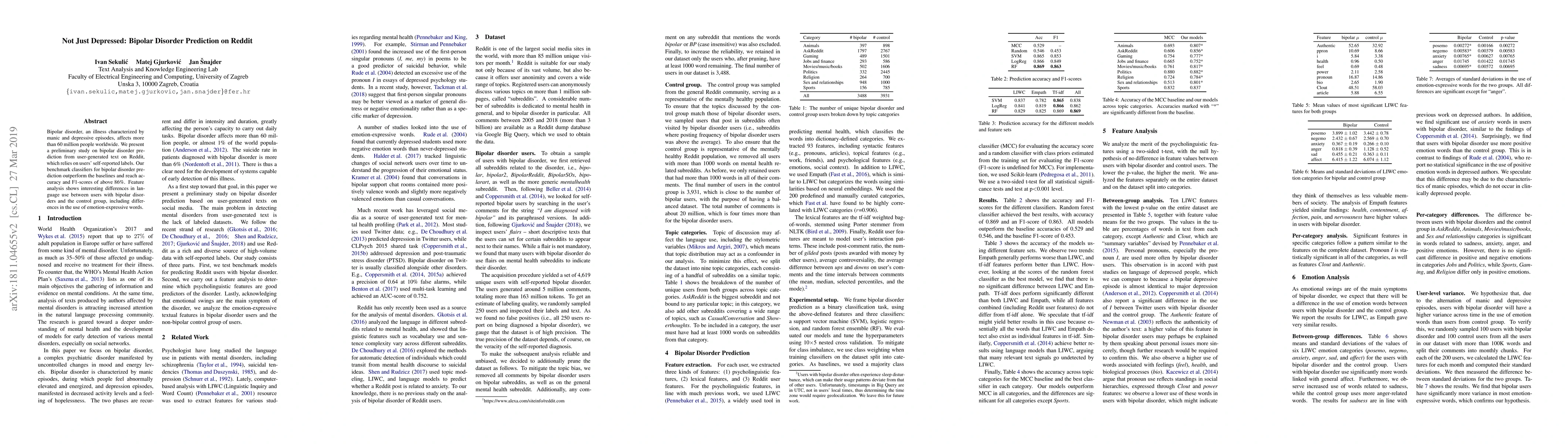 This study predicts bipolar disorder from Reddit users' self-reported text, achieving high accuracy and F1-scores above 86%. The analysis reveals distinct language patterns, particularly in emotion-expressive words, between individuals with bipolar disorder and a control group.