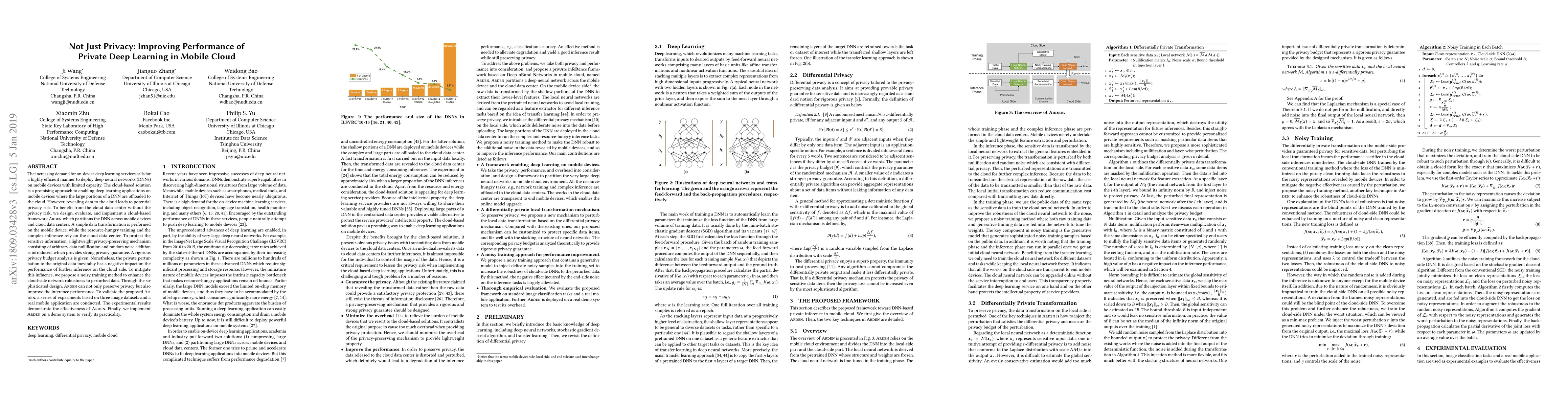 The paper proposes ARDEN, a cloud-based framework for deploying deep neural networks on mobile devices while preserving privacy through data transformation and noise addition. ARDEN enhances performance by introducing a noisy training method to improve cloud-side network robustness, validated through experiments on image datasets and a real mobile application.