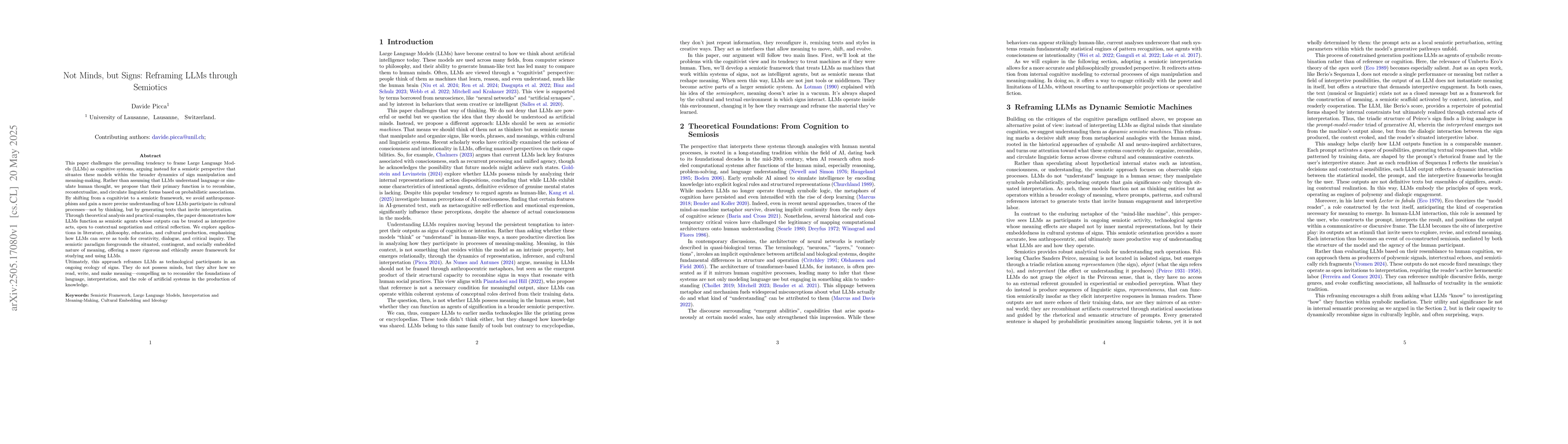 The paper proposes a novel semiotic perspective on LLMs, reframing them as technological participants in the ecology of signs rather than cognitive systems.