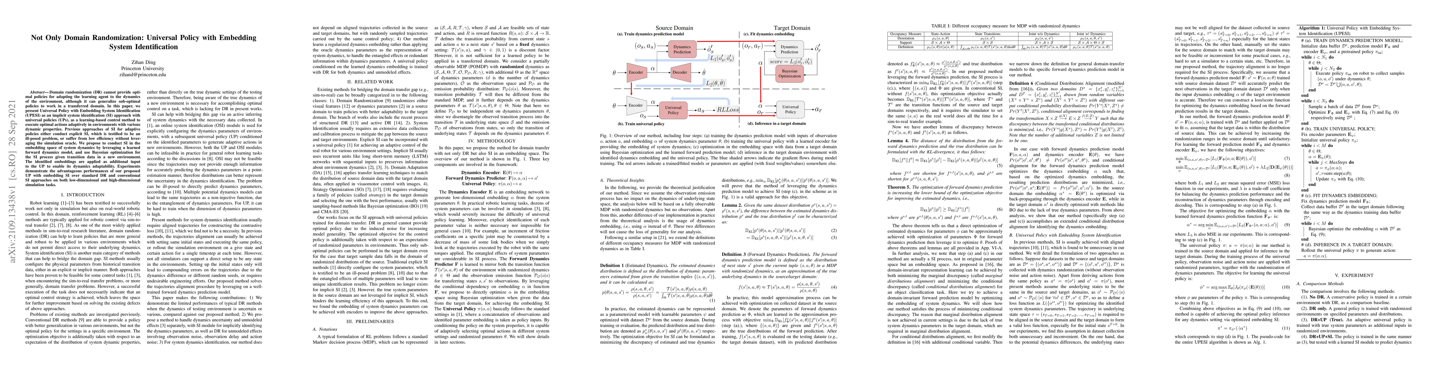 Researchers propose a new approach called Universal Policy with Embedding System Identification that enables optimal policy adaptation in environments with varying dynamics, outperforming existing domain randomization and system identification methods.