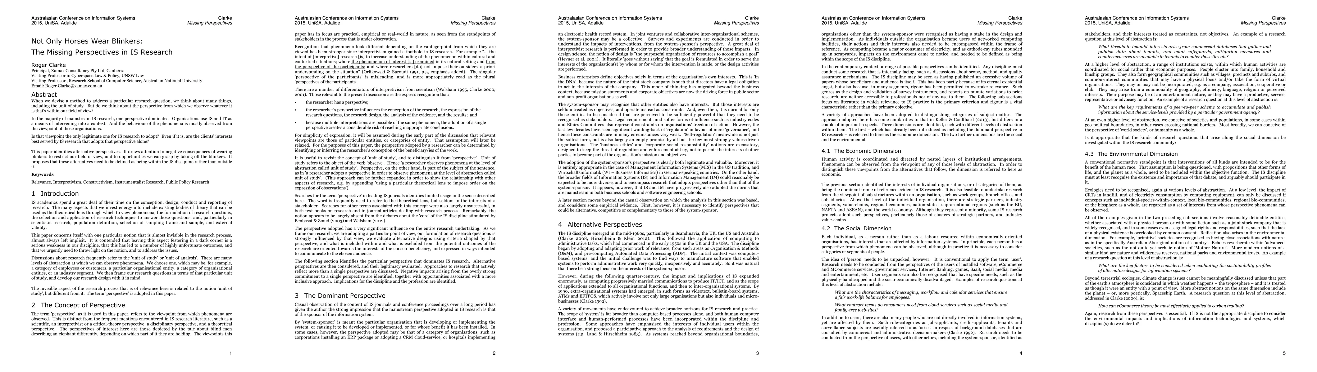 When we devise a method to address a particular research question, we think about many things, including the unit of study. But do we think about the perspective from which we observe whatever it is that's within our field of view? In the majority of mainstream IS research, one perspective dominates. Organisations use IS and IT as a means of intervening into a context. And the behaviour of the phenomena is mostly observed from the viewpoint of those organisations. Is that viewpoint the only legitimate one for IS research to adopt? Even if it is, are the clients' interests best served by IS research that adopts that perspective alone? This paper identifies alternative perspectives. It draws attention to negative consequences of wearing blinkers to restrict our field of view, and to opportunities we can grasp by taking off the blinkers. It proposes that these alternatives need to be defined as being within the IS discipline rather than outside it.