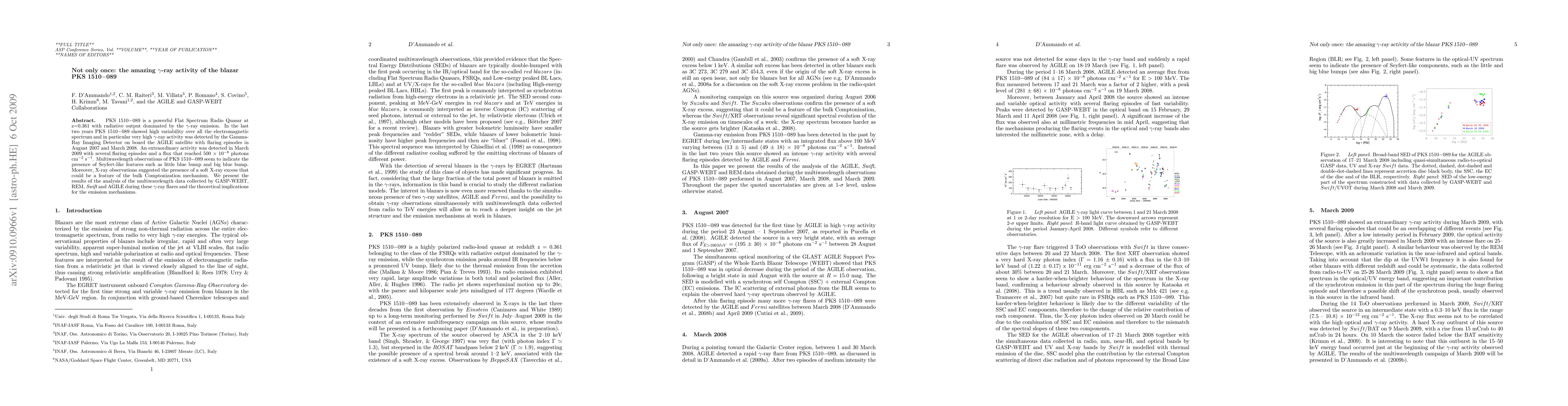 PKS 1510-089, a Flat Spectrum Radio Quasar, exhibited extraordinary gamma-ray activity with significant flaring episodes in 2007, 2008, and especially in March 2009, reaching a flux of 500 x 10^{-8} photons cm^{-2} s^{-1}. Multiwavelength observations suggest Seyfert-like features and a possible bulk Comptonization mechanism.