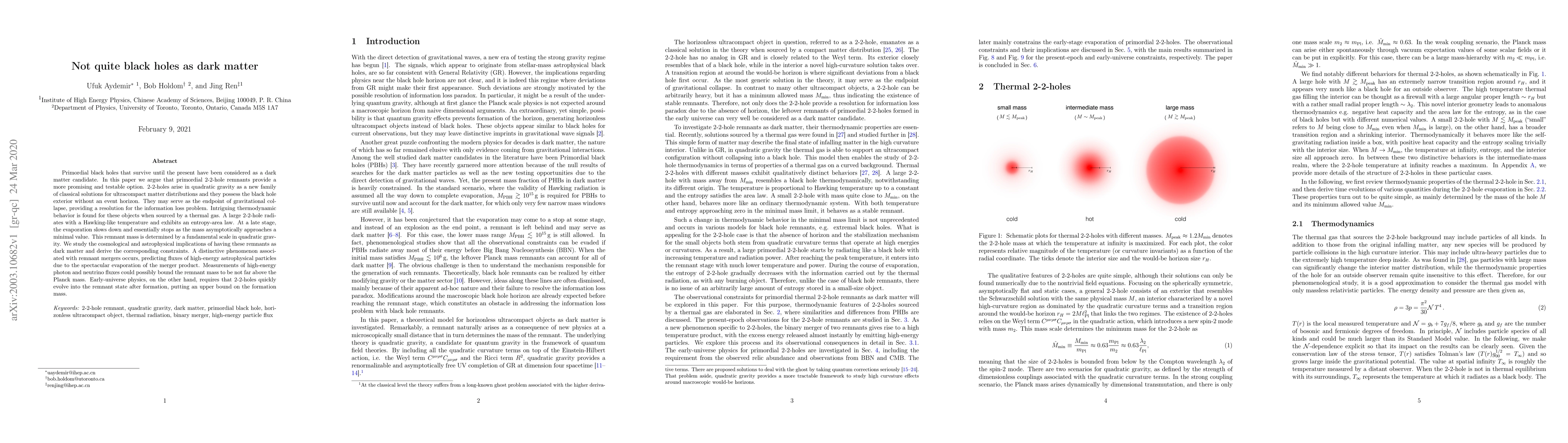 This paper proposes that primordial 2-2-hole remnants, arising in quadratic gravity, are a more promising dark matter candidate than traditional black holes. These remnants exhibit Hawking-like radiation and thermodynamic properties, with implications for high-energy astrophysical particle fluxes and constraints on their mass from cosmological and astrophysical observations.