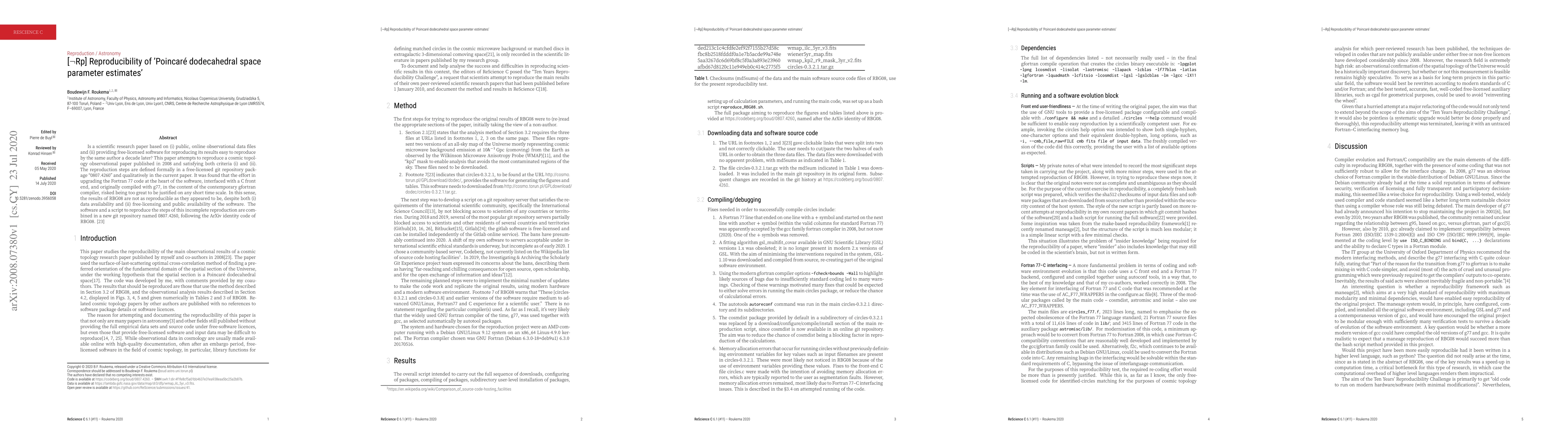 Is a scientific research paper based on (i) public, online observational data files and (ii) providing free-licensed software for reproducing its results easy to reproduce by the same author a decade later? This paper attempts to reproduce a cosmic topology observational paper published in 2008 and satisfying both criteria (i) and (ii). The reproduction steps are defined formally in a free-licensed git repository package "0807.4260" and qualitatively in the current paper. It was found that the effort in upgrading the Fortran 77 code at the heart of the software, interfaced with a C front end, and originally compiled with g77, in the content of the contemporary gfortran compiler, risked being too great to be justified on any short time scale. In this sense, the results of RBG08 are not as reproducible as they appeared to be, despite both (i) data availability and (ii) free-licensing and public availability of the software. The software and a script to reproduce the steps of this incomplete reproduction are combined in a new git repository named 0807.4260, following the ArXiv identity code (arXiv:0807.4260) of RBG08.