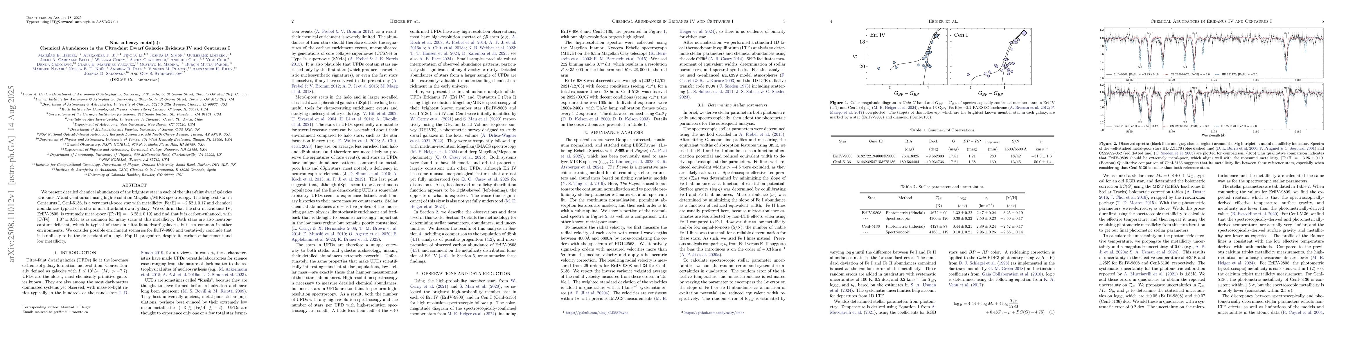 We present detailed chemical abundances of the brightest star in each of the ultra-faint dwarf galaxies Eridanus IV and Centaurus I using high-resolution Magellan/MIKE spectroscopy. The brightest star in Centaurus I, CenI-5136, is a very metal-poor star with metallicity [Fe/H] = $-2.52\pm0.17$ and chemical abundances typical of a star in an ultra-faint dwarf galaxy. We confirm that the star in Eridanus IV, EriIV-9808, is extremely metal-poor ([Fe/H] = $-3.25\pm0.19$) and find that it is carbon-enhanced, with [C/Fe] = $1.07\pm0.34$, as is common for many stars at this metallicity. Both stars are also neutron-capture deficient, which is typical of stars in ultra-faint dwarf galaxies, but less common in other environments. We consider possible enrichment scenarios for EriIV-9808 and tentatively conclude that it is unlikely to be the descendant of a single Pop III progenitor, despite its carbon-enhancement and low metallicity.