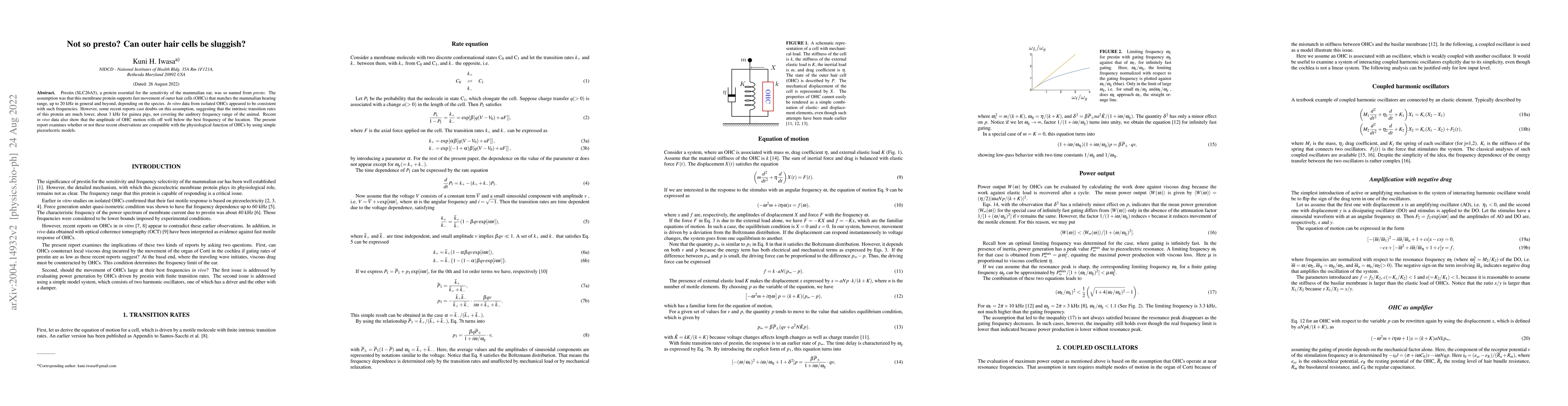 Prestin (SLC26A5), a protein essential for the sensitivity of the mammalian ear, was so named from \emph{presto}. The assumption was that this membrane protein supports fast movement of outer hair cells (OHCs) that matches the mammalian hearing range, up to 20 kHz in general and beyond, depending on the species. \emph{In vitro} data from isolated OHCs appeared to be consistent with such frequencies. However, some recent reports cast doubts on this assumption, suggesting that the intrinsic transition rates of this protein are much lower, about 3 kHz for guinea pigs, not covering the auditory frequency range of the animal. Recent \emph{in vivo} data also show that the amplitude of OHC motion rolls off well below the best frequency of the location. The present report examines whether or not these resent observations are compatible with the physiological function of OHCs by using simple piezoelectric models.