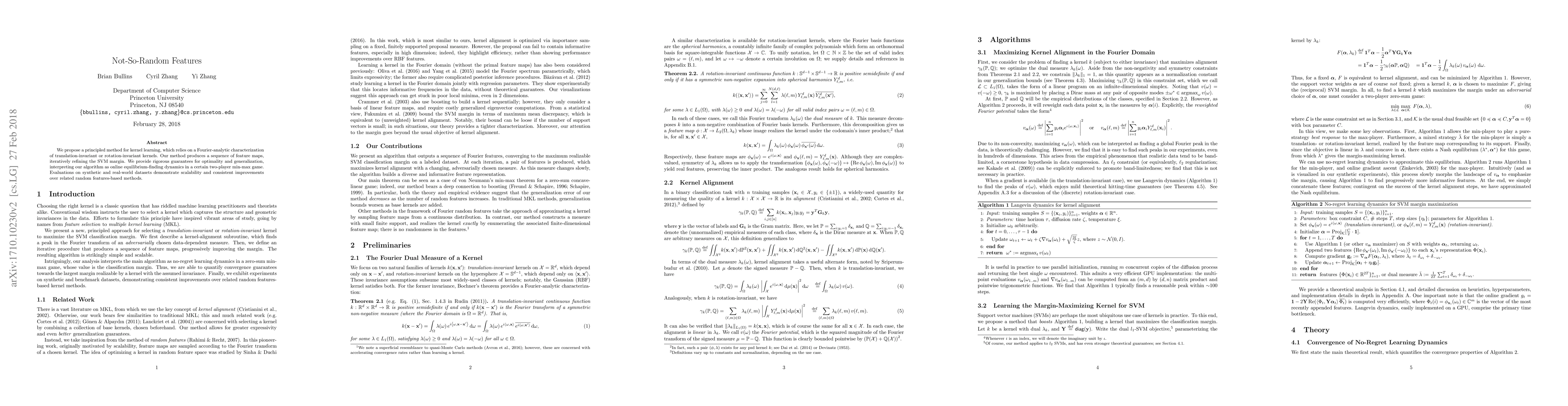We propose a principled method for kernel learning, which relies on a Fourier-analytic characterization of translation-invariant or rotation-invariant kernels. Our method produces a sequence of feature maps, iteratively refining the SVM margin. We provide rigorous guarantees for optimality and generalization, interpreting our algorithm as online equilibrium-finding dynamics in a certain two-player min-max game. Evaluations on synthetic and real-world datasets demonstrate scalability and consistent improvements over related random features-based methods.