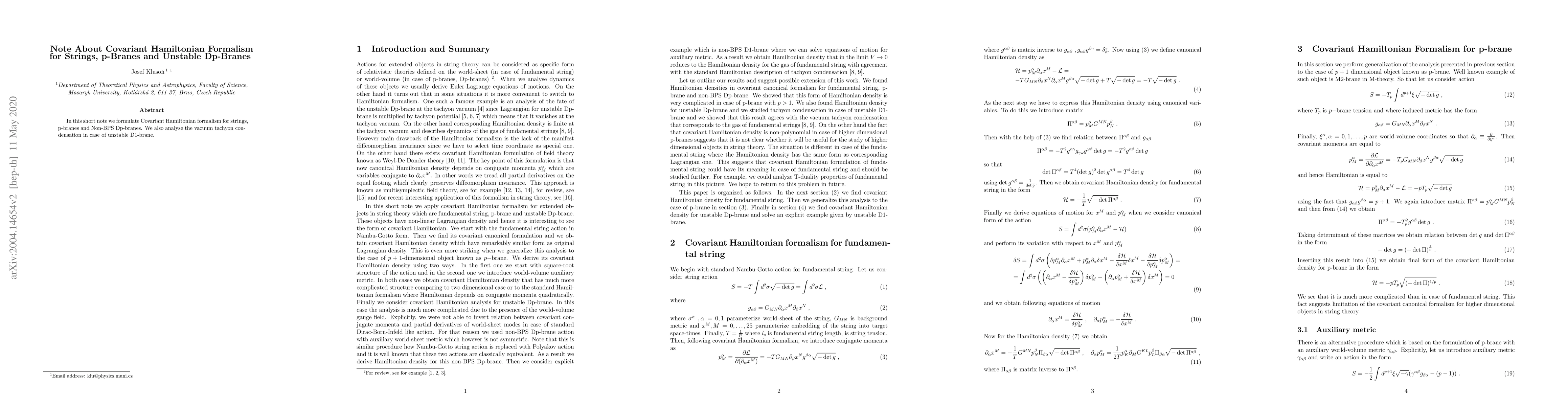 This note formulates a covariant Hamiltonian formalism for strings, p-branes, and Non-BPS Dp-branes, and examines vacuum tachyon condensation specifically in unstable D1-brane scenarios.