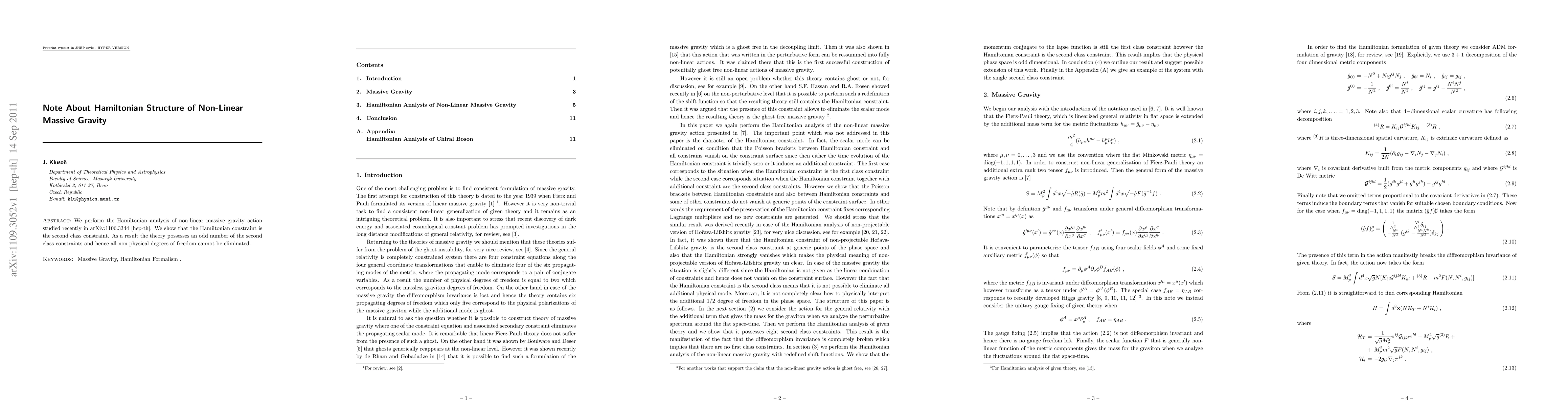 We perform the Hamiltonian analysis of non-linear massive gravity action studied recently in arXiv:1106.3344 [hep-th]. We show that the Hamiltonian constraint is the second class constraint. As a result the theory possesses an odd number of the second class constraints and hence all non physical degrees of freedom cannot be eliminated.