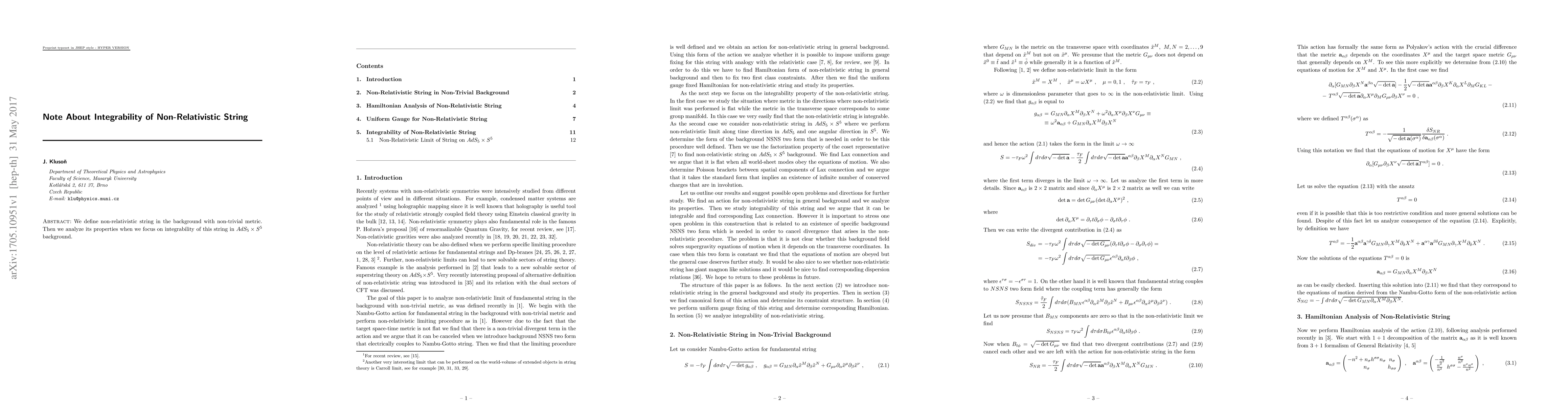 We define non-relativistic string in the background with non-trivial metric. Then we analyze its properties when we focus on integrability of this string in AdS(5)xS(5) background.