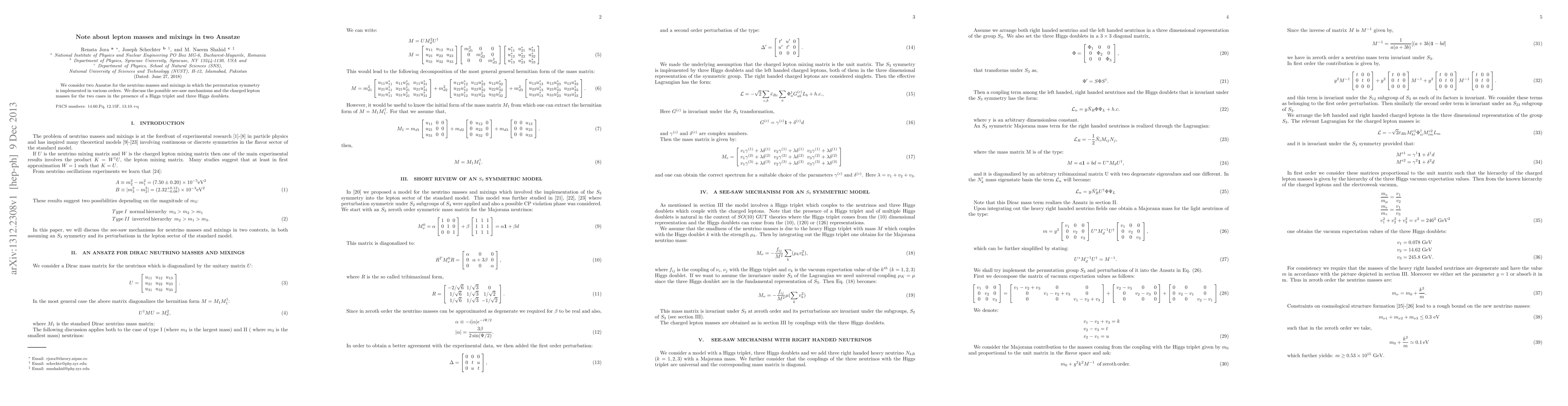 This paper explores two Ansatze for neutrino masses and mixings, incorporating permutation symmetry in different orders. It examines see-saw mechanisms and charged lepton masses in the context of a Higgs triplet and three Higgs doublets.