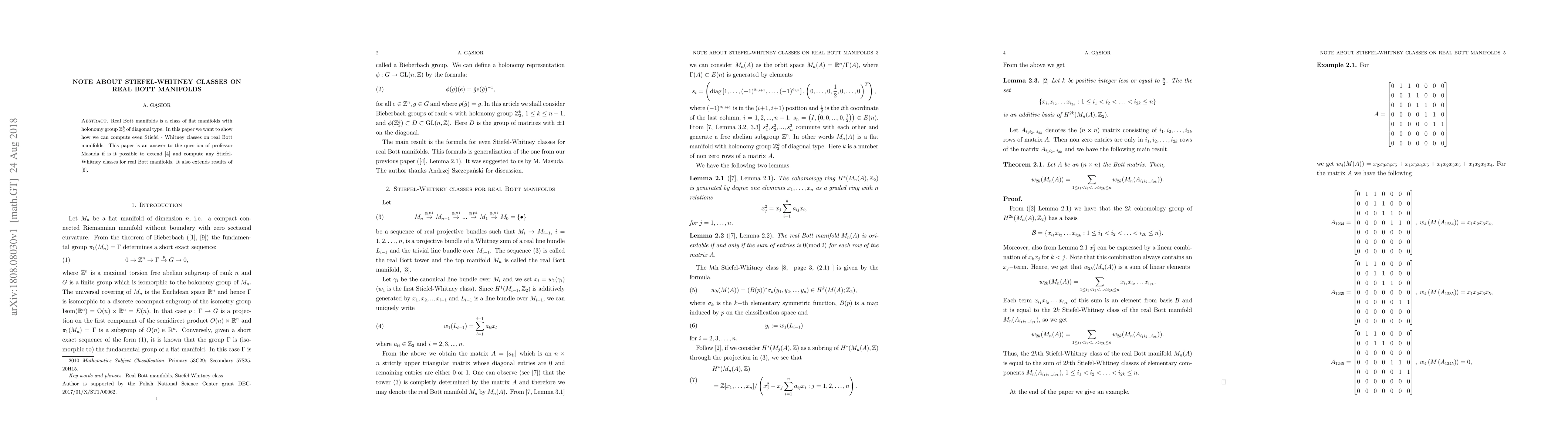 This paper computes even Stiefel-Whitney classes on real Bott manifolds, extending previous results on spin structures and flat manifolds with specific holonomy groups. The work answers questions posed by professor Masuda regarding the computation of Stiefel-Whitney classes for these manifolds.