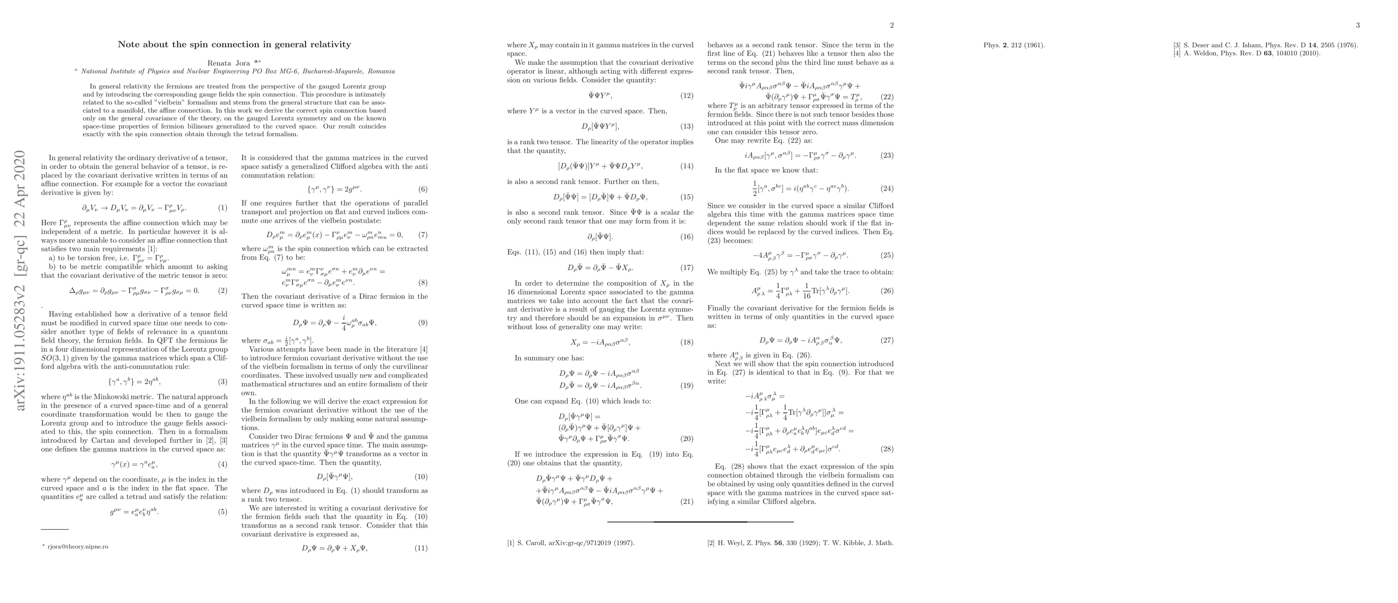 In general relativity the fermions are treated from the perspective of the gauged Lorentz group and by introducing the corresponding gauge fields the spin connection. This procedure is intimately related to the so-called "vielbein" formalism and stems from the general structure that can be associated to a manifold, the affine connection. In this work we derive the correct spin connection based only on the general covariance of the theory, on the gauged Lorentz symmetry and on the known space-time properties of fermion bilinears generalized to the curved space. Our result coincides exactly with the spin connection obtain through the tetrad formalism.