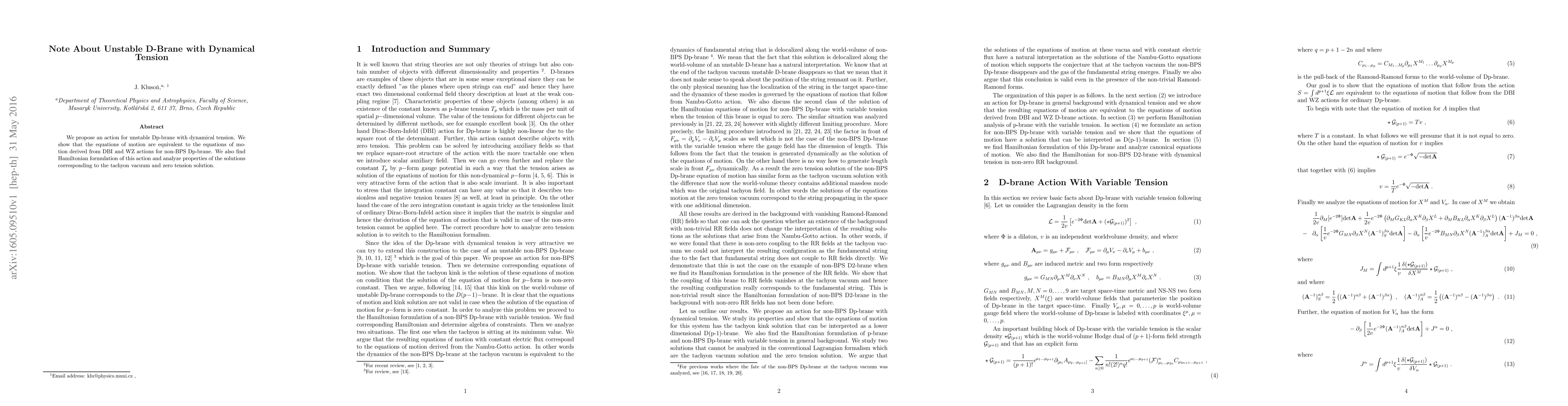 We propose an action for unstable Dp-brane with dynamical tension. We show that the equations of motion are equivalent to the equations of motion derived from DBI and WZ actions for non-BPS Dp-brane. We also find Hamiltonian formulation of this action and analyze properties of the solutions corresponding to the tachyon vacuum and zero tension solution.