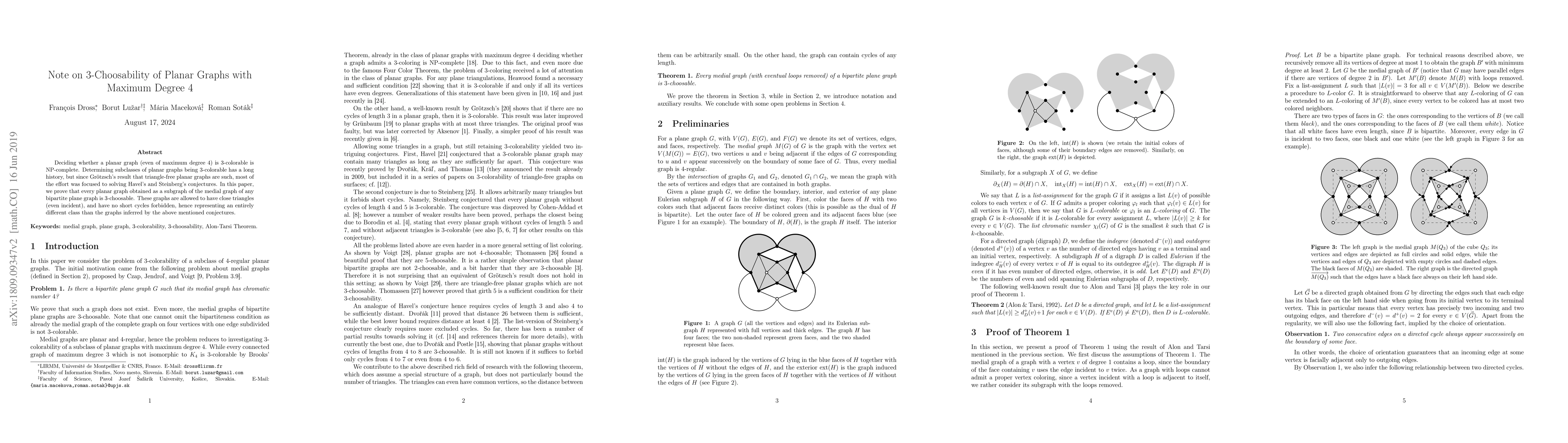 This paper proves that every planar graph of maximum degree 4 derived from the medial graph of any bipartite plane graph is 3-choosable, representing a distinct class beyond the scope of previous conjectures focused on triangle-free planar graphs.
