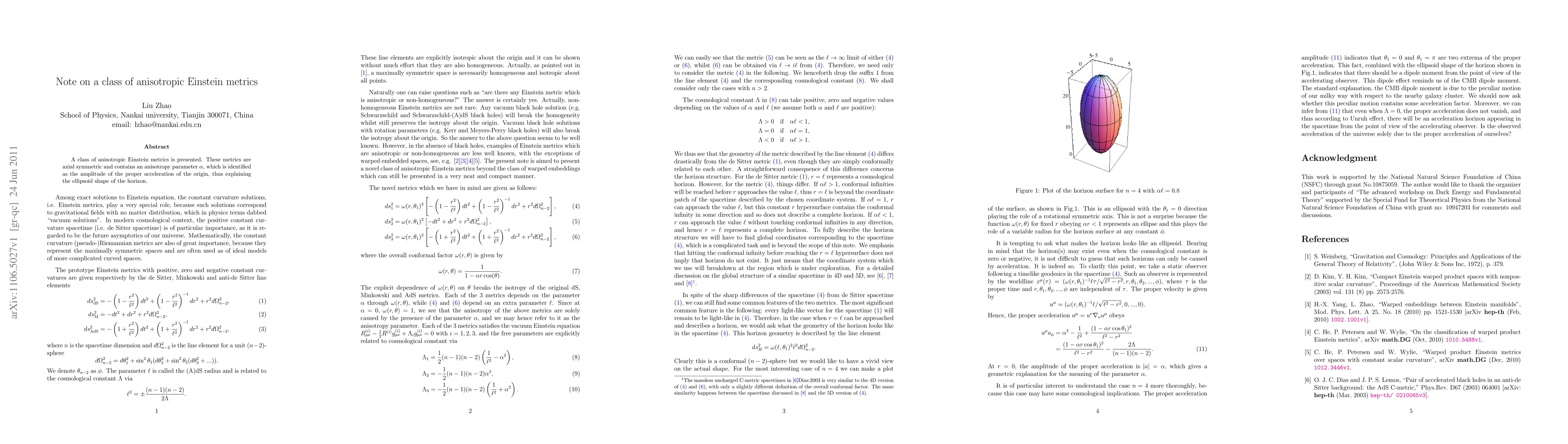 A class of anisotropic Einstein metrics is presented. These metrics are axial symmetric and contains an anisotropy parameter $\alpha$, which is identified as the amplitude of the proper acceleration of the origin, thus explaining the ellipsoid shape of the horizon.