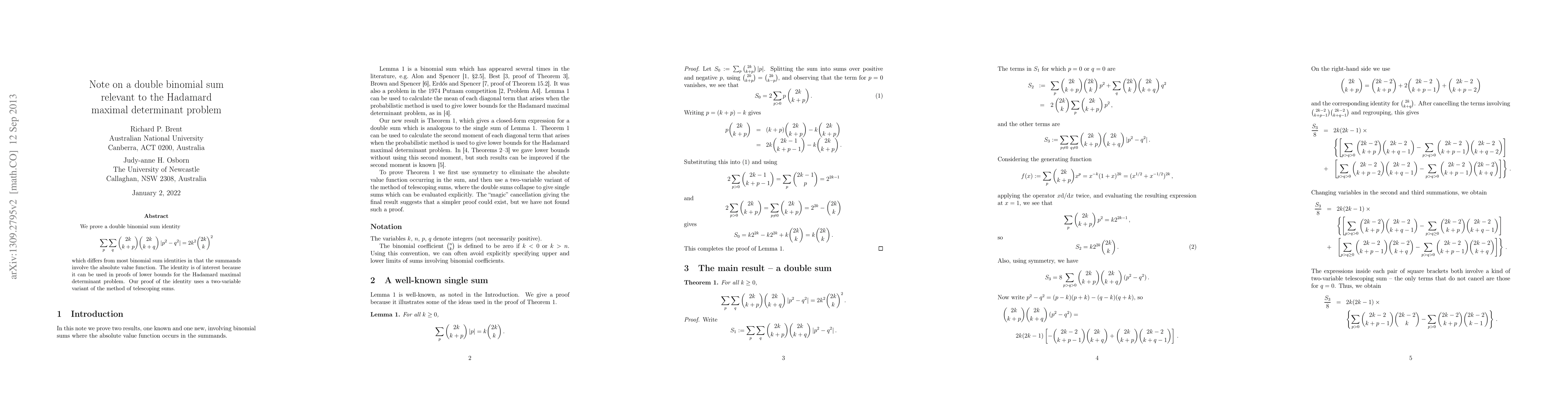This paper proves a unique double binomial sum identity involving absolute values, employing a two-variable telescoping sums method. The identity is significant for establishing lower bounds in the Hadamard maximal determinant problem.