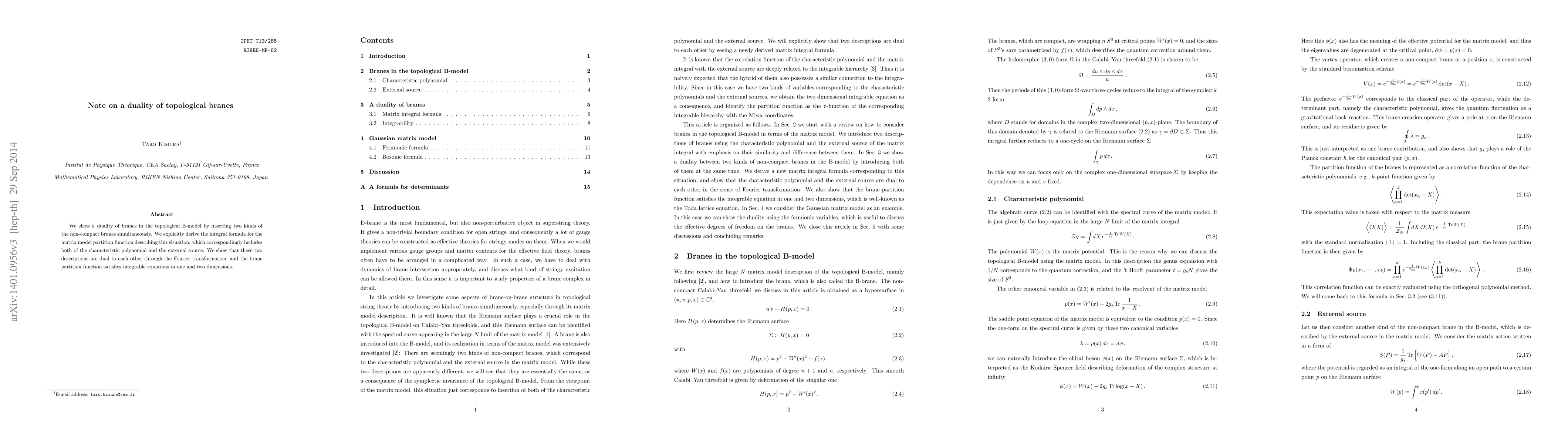 We show a duality of branes in the topological B-model by inserting two kinds of the non-compact branes simultaneously. We explicitly derive the integral formula for the matrix model partition function describing this situation, which correspondingly includes both of the characteristic polynomial and the external source. We show that these two descriptions are dual to each other through the Fourier transformation, and the brane partition function satisfies integrable equations in one and two dimensions.