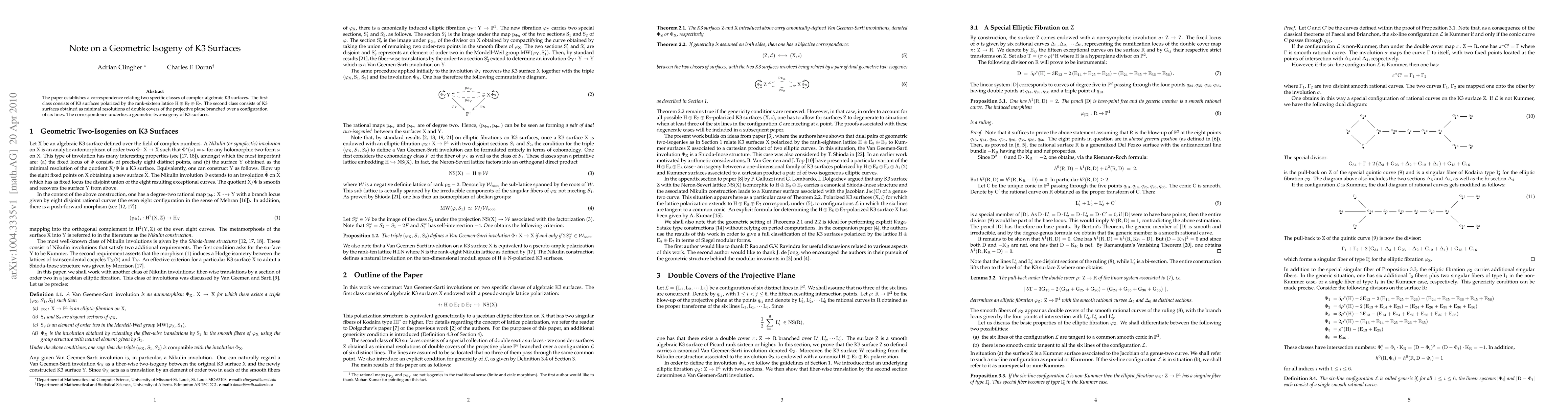 The paper presents a correspondence between two classes of complex algebraic K3 surfaces: one polarized by a specific lattice and the other obtained from double covers of the projective plane, highlighting a geometric two-isogeny relationship.
