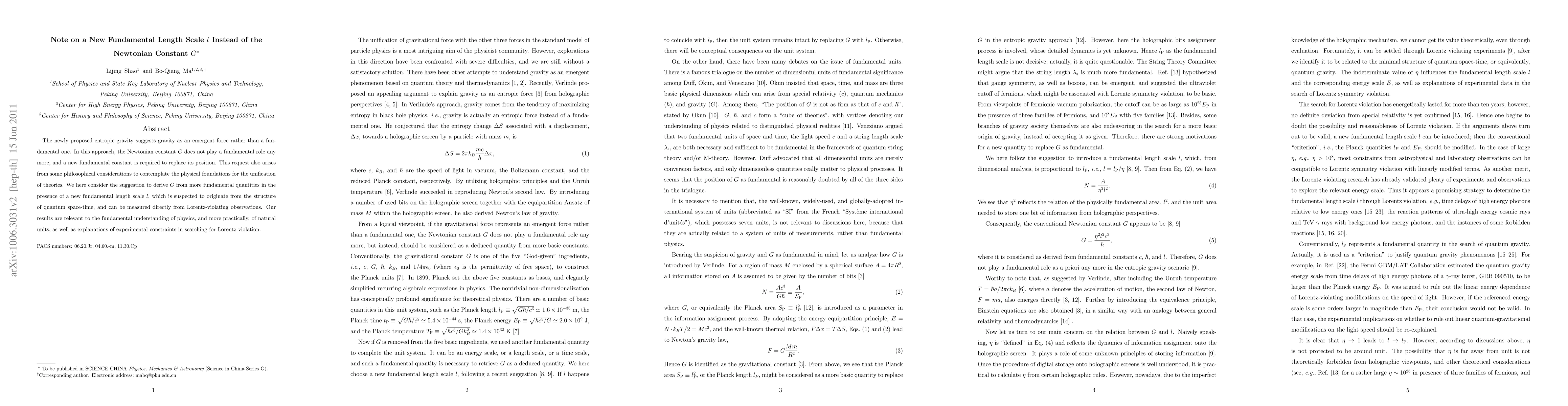This paper proposes a new fundamental length scale $l$ to replace the Newtonian constant $G$ in entropic gravity, suggesting gravity as an emergent force. It explores deriving $G$ from more fundamental quantities, with implications for fundamental physics and natural units, as well as experimental constraints in Lorentz violation searches.