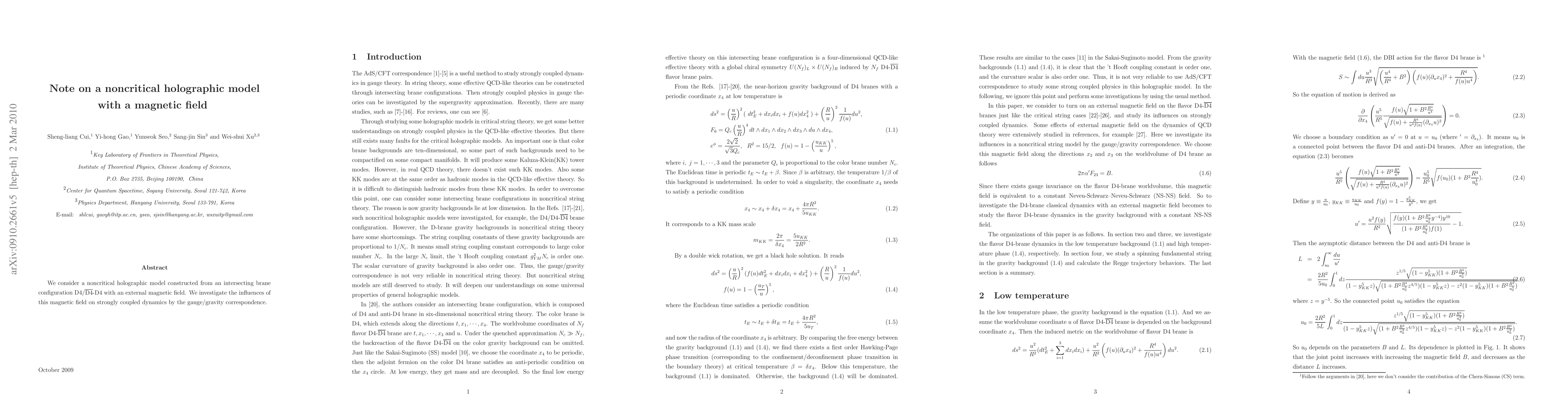 We consider a noncritical holographic model constructed from an intersecting brane configuration D4/$\bar{\rm{D4}}$-D4 with an external magnetic field. We investigate the influences of this magnetic field on strongly coupled dynamics by the gauge/gravity correspondence.