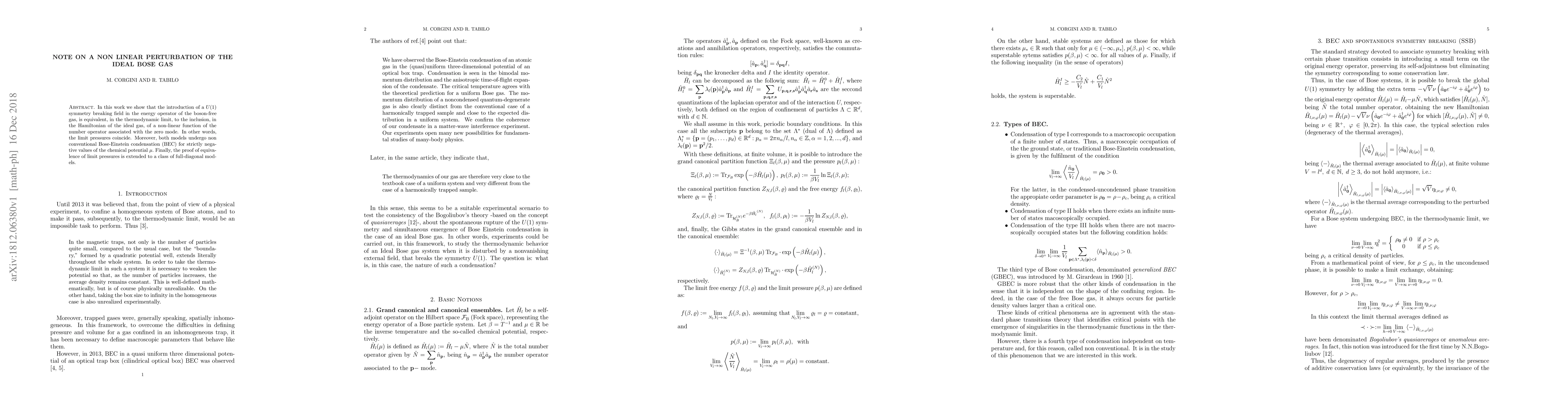 In this work we show that the introduction of a U(1) symmetry breaking field in the energy operator of the boson-free gas, is equivalent, in the thermodynamic limit, to the inclusion, in the Hamiltonian of the ideal gas, of a non-linear function of the number operator associated with the zero mode. In other words, the limit pressures coincide. Moreover, both models undergo non conventional Bose-Einstein condensation (BEC) for strictly negative values of the chemical potential $\mu.$ Finally, the proof of equivalence of limit pressures is extended to a class of full-diagonal models.