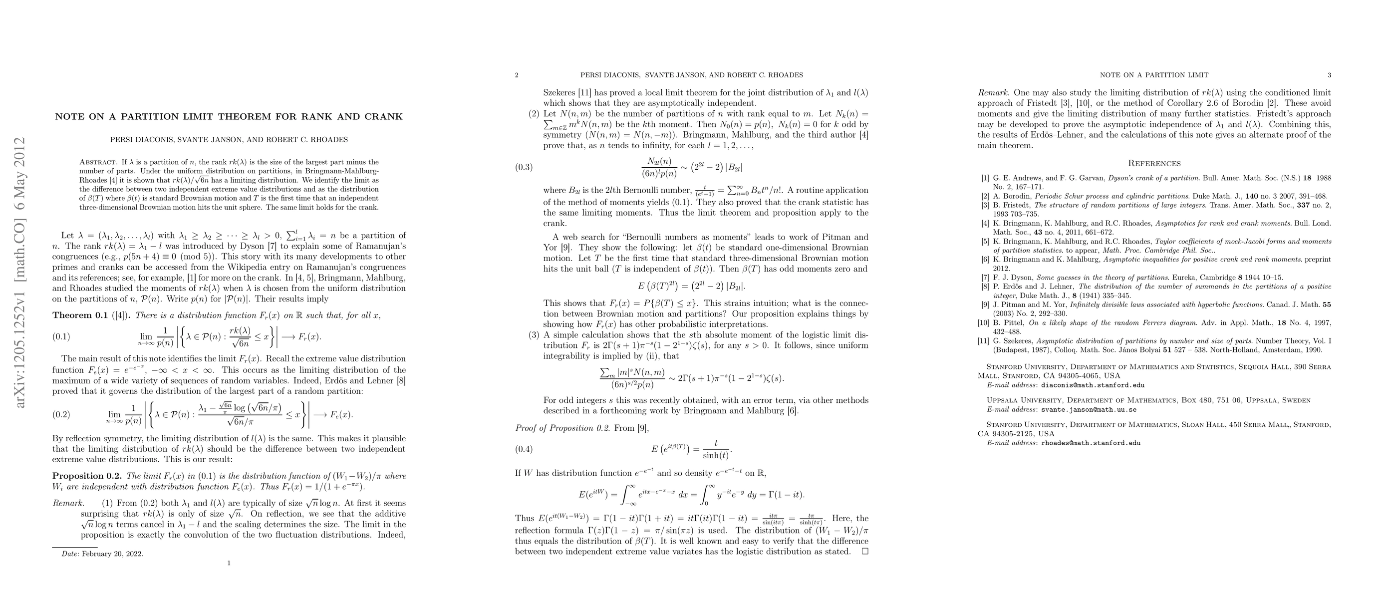 The paper shows that under the uniform distribution on partitions, the rank and crank statistics have a limiting distribution as partition size increases, which is found to be related to Brownian motion.