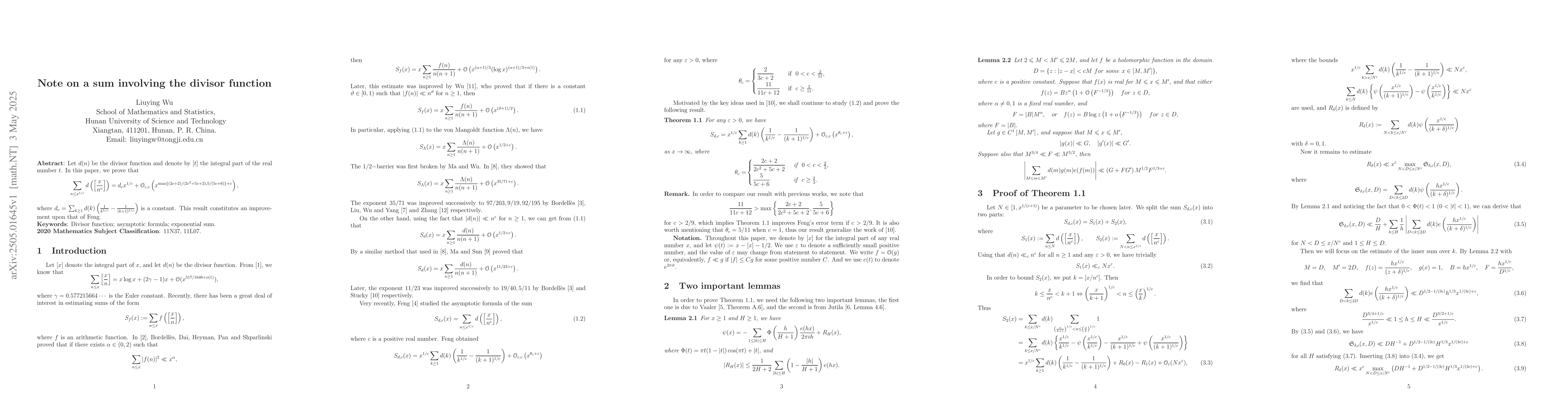 This paper improves upon a previous result by proving a sum involving the divisor function, d(n), which relates to the number of divisors of a given integer x^1/c.