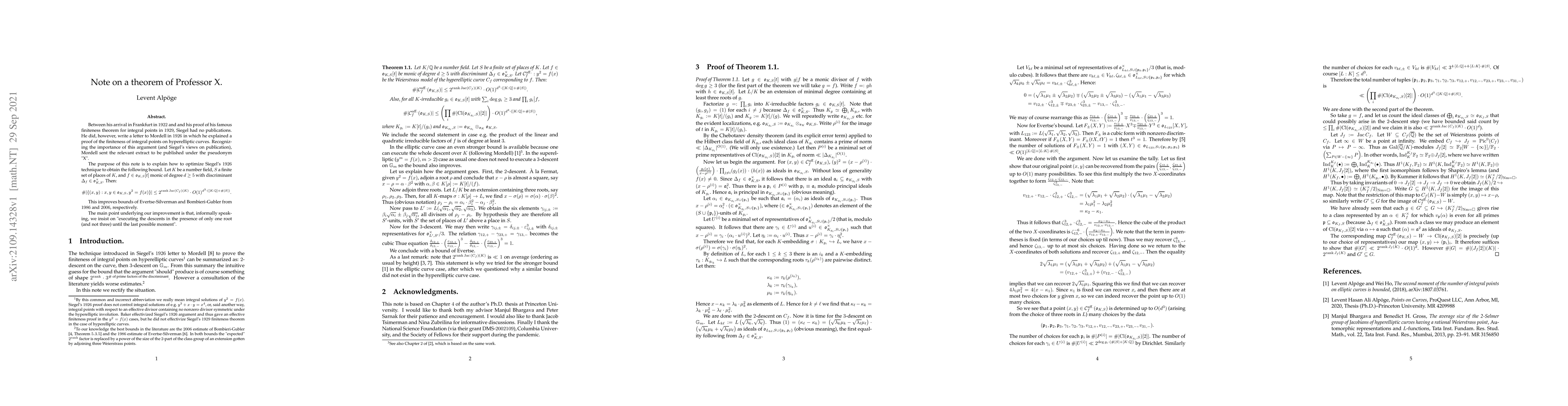 Between his arrival in Frankfurt in $1922$ and and his proof of his famous finiteness theorem for integral points in $1929$, Siegel had no publications. He did, however, write a letter to Mordell in $1926$ in which he explained a proof of the finiteness of integral points on hyperelliptic curves. Recognizing the importance of this argument (and Siegel's views on publication), Mordell sent the relevant extract to be published under the pseudonym "X". The purpose of this note is to explain how to optimize Siegel's $1926$ technique to obtain the following bound. Let $K$ be a number field, $S$ a finite set of places of $K$, and $f\in \mathfrak{o}_{K,S}[t]$ monic of degree $d\geq 5$ with discriminant $\Delta_f\in \mathfrak{o}_{K,S}^\times$. Then: $$\#|\{(x,y) : x,y\in \mathfrak{o}_{K,S}, y^2 = f(x)\}|\leq 2^{\mathrm{rank}\,\mathrm{Jac}(C_f)(K)}\cdot O(1)^{d^3\cdot ([K:\mathbb{Q}] + \#|S|)}.$$ This improves bounds of Evertse-Silverman and Bombieri-Gubler from $1986$ and $2006$, respectively. The main point underlying our improvement is that, informally speaking, we insist on "executing the descents in the presence of only one root (and not three) until the last possible moment".